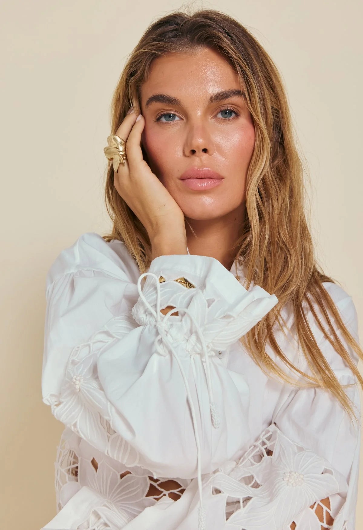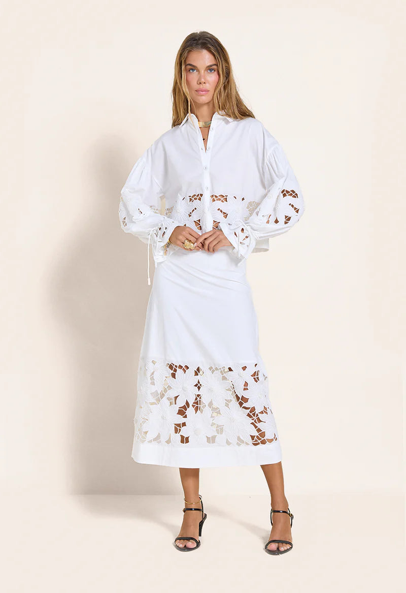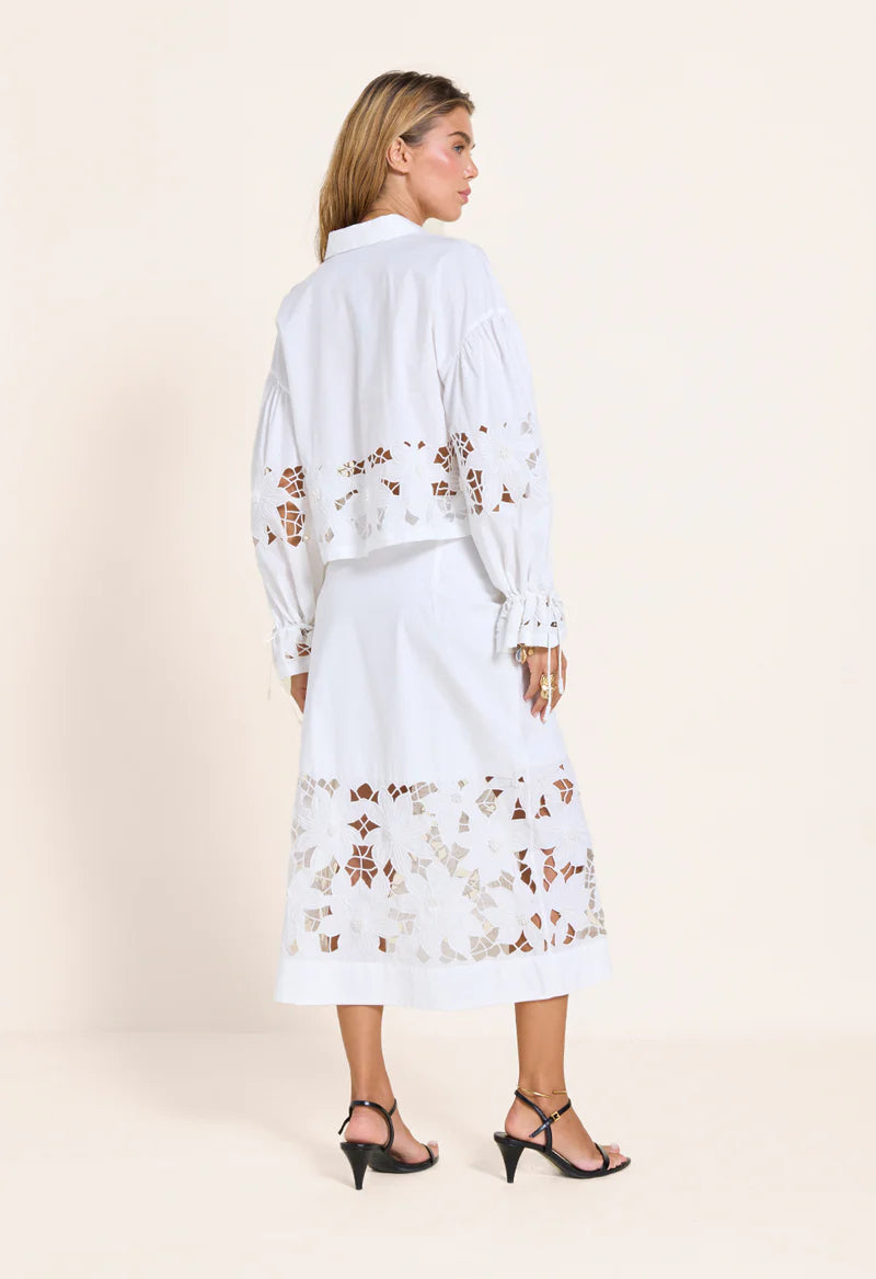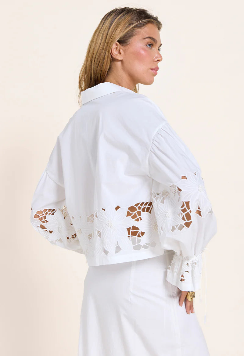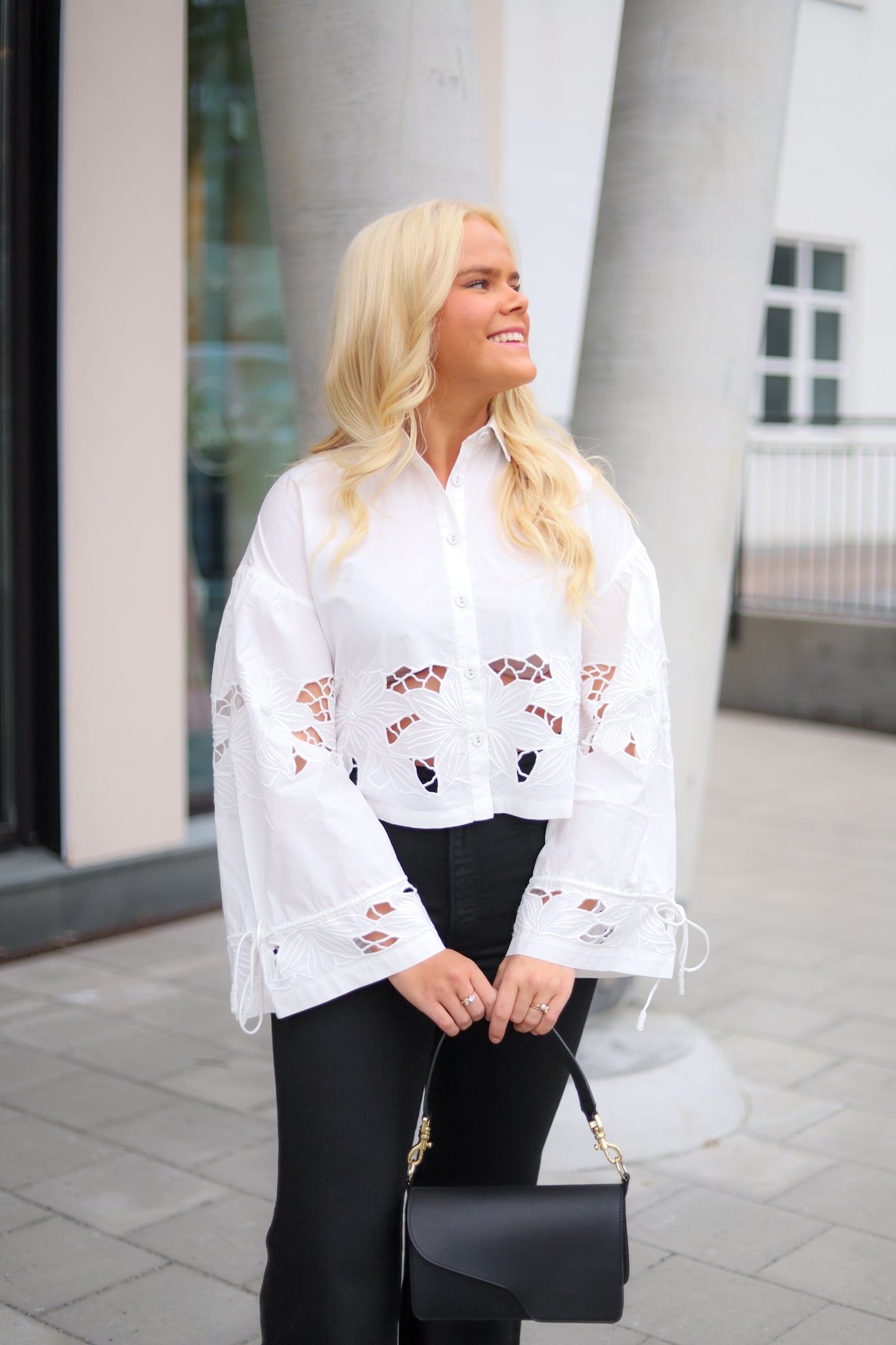 Elegant skjorte i klassisk hvit med lekre broderidetaljer fra Scarlett Poppies. Modellen er oversized og boxy med croppet lengde. Klassisk skjortekrage med ton-i-ton trukne knapper i front. Lange voluminøse ermer med droppet skulder og justerbart knytebånd i mansjett. Denne skjorten løfter ethvert antrekk!