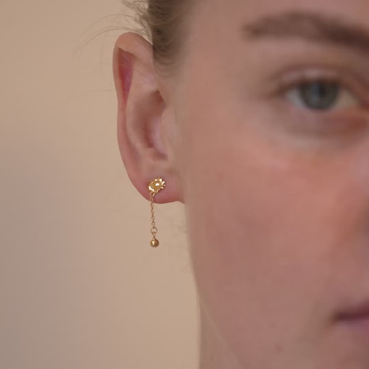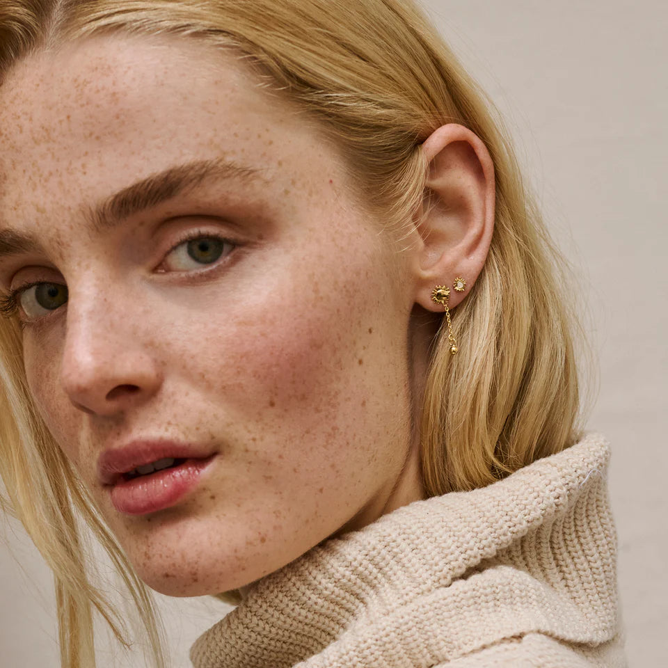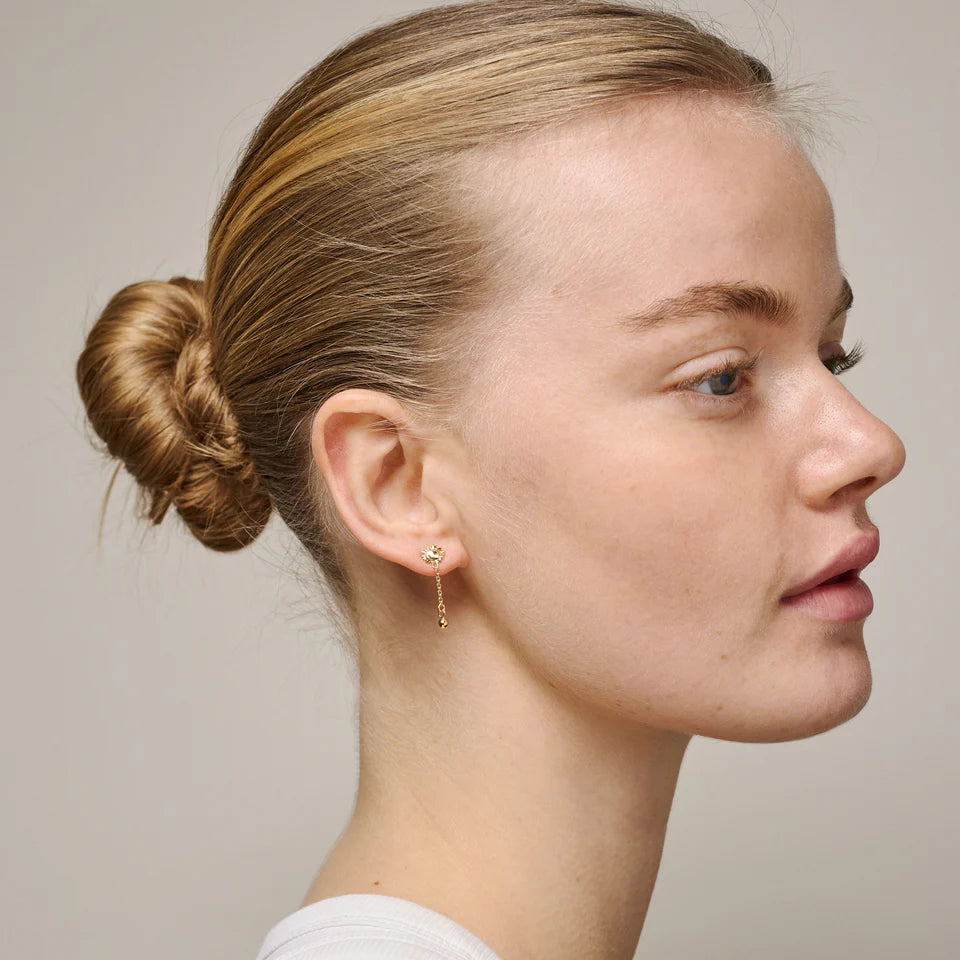 Søt ørepynt fra Enamel Copenhagen i gullforgylt sterlingsølv. Sunshine Drop består av en delikat solsikke-sol, med et lite stykke kjede nedenfor med en gullkule. Øredobben er delikat og liten, men har mye karakter da den er leken og unik. Perfekt alene eller i kombinasjon med annen ørepynt.