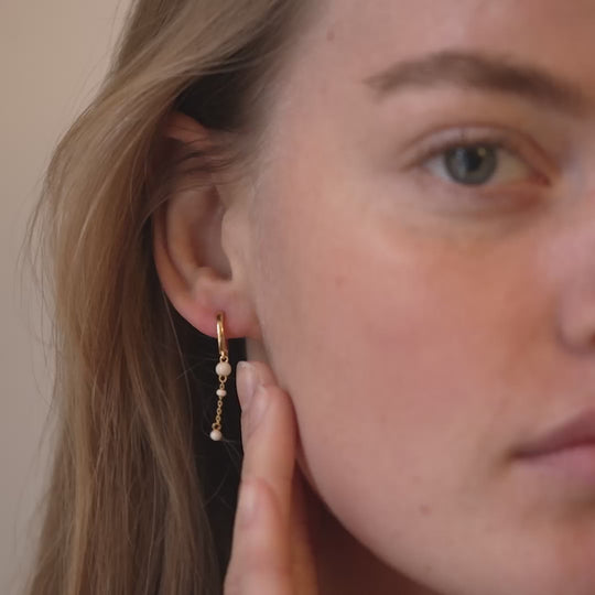 Vakker ørepynt fra Enamel Copenhagen i gullforgylt sterlingsølv. Hoops med elegant tynn lenke og små emaljerte kuler i offwhite. Lola-serien finnes også som armbånd og kjede.