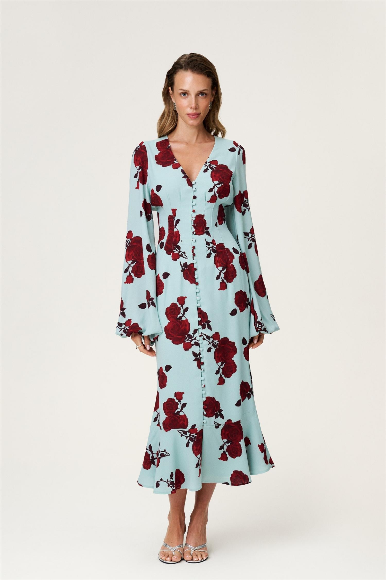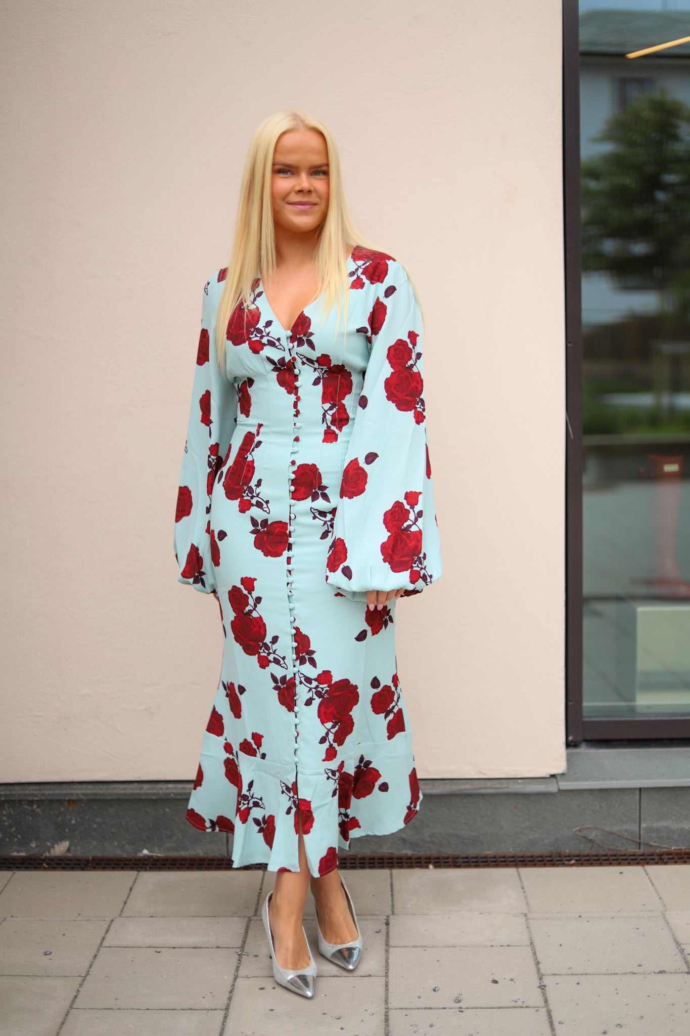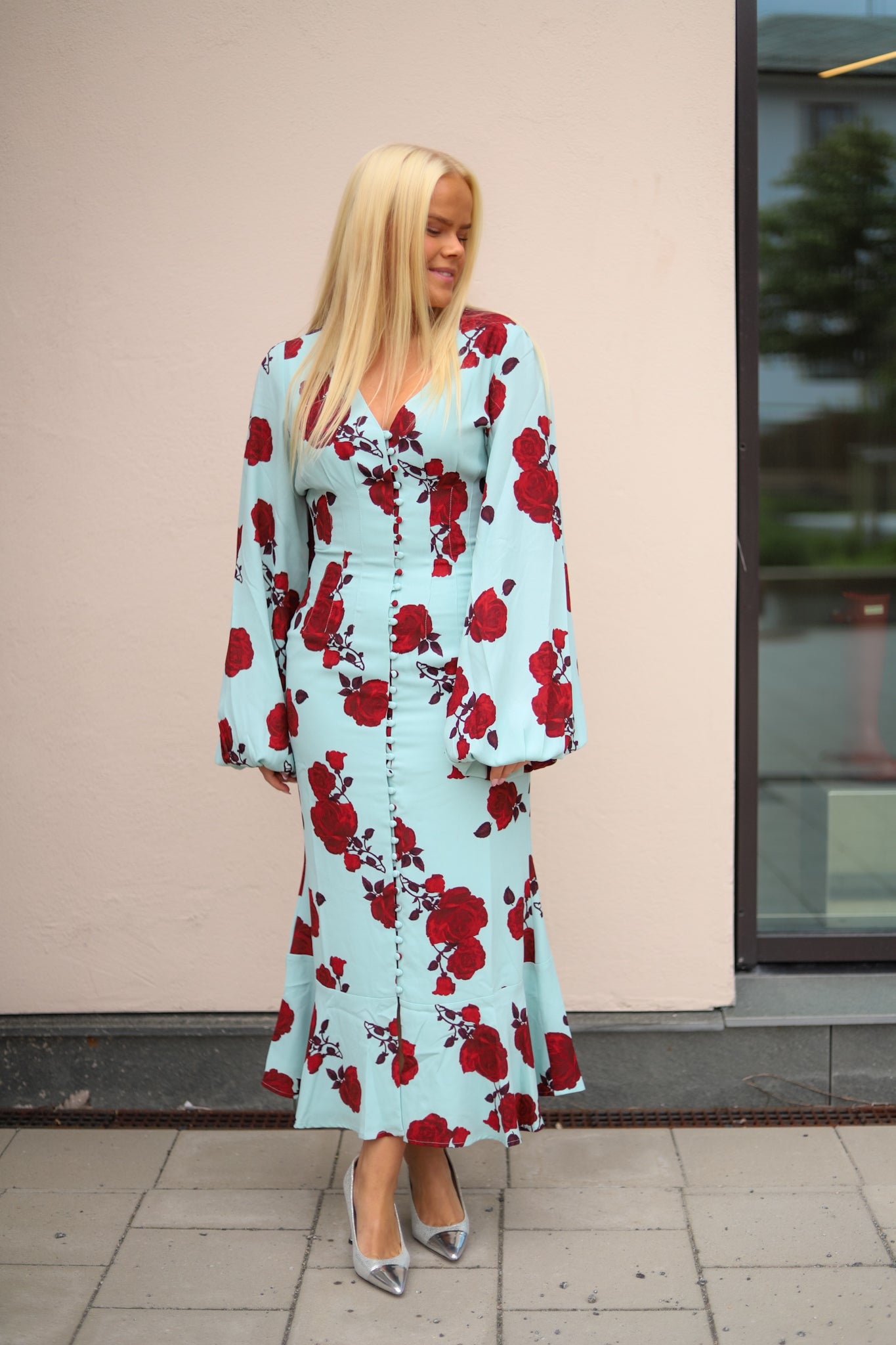 Nydelig kjole i fresh kombo av mintfarget bunn og rødt roseprint fra Adoore. Flatterende midikjole med dekorative innsnitt i midjen og kappe i hem. Kjolen har pen v-hals og delikate trukne knapper langs fronten. Kjolen er lett fóret og har lange ballongermer med strikk i mansjett.