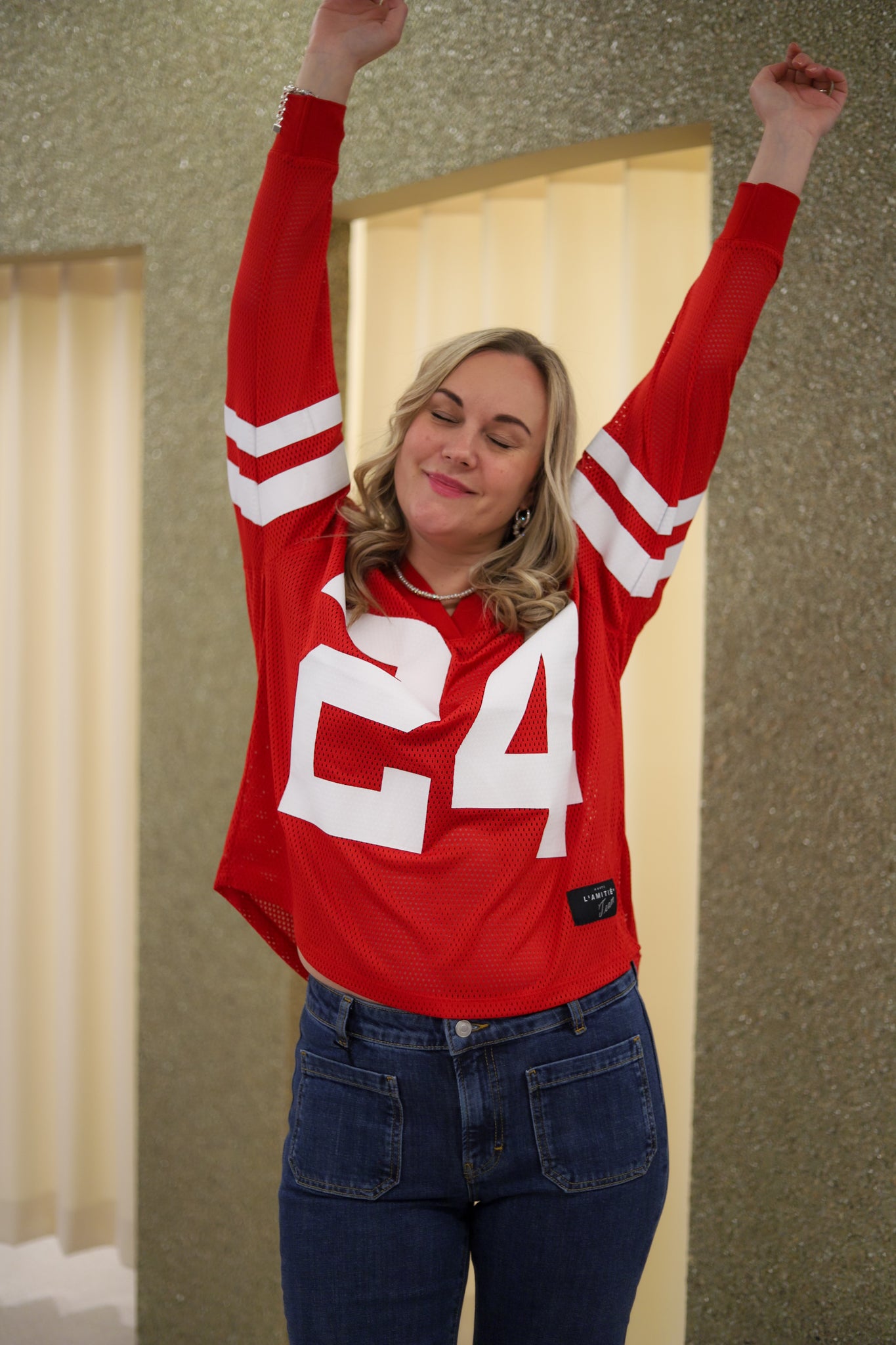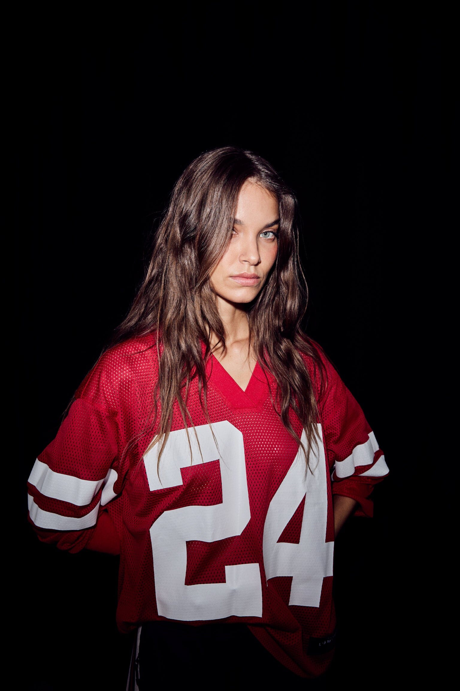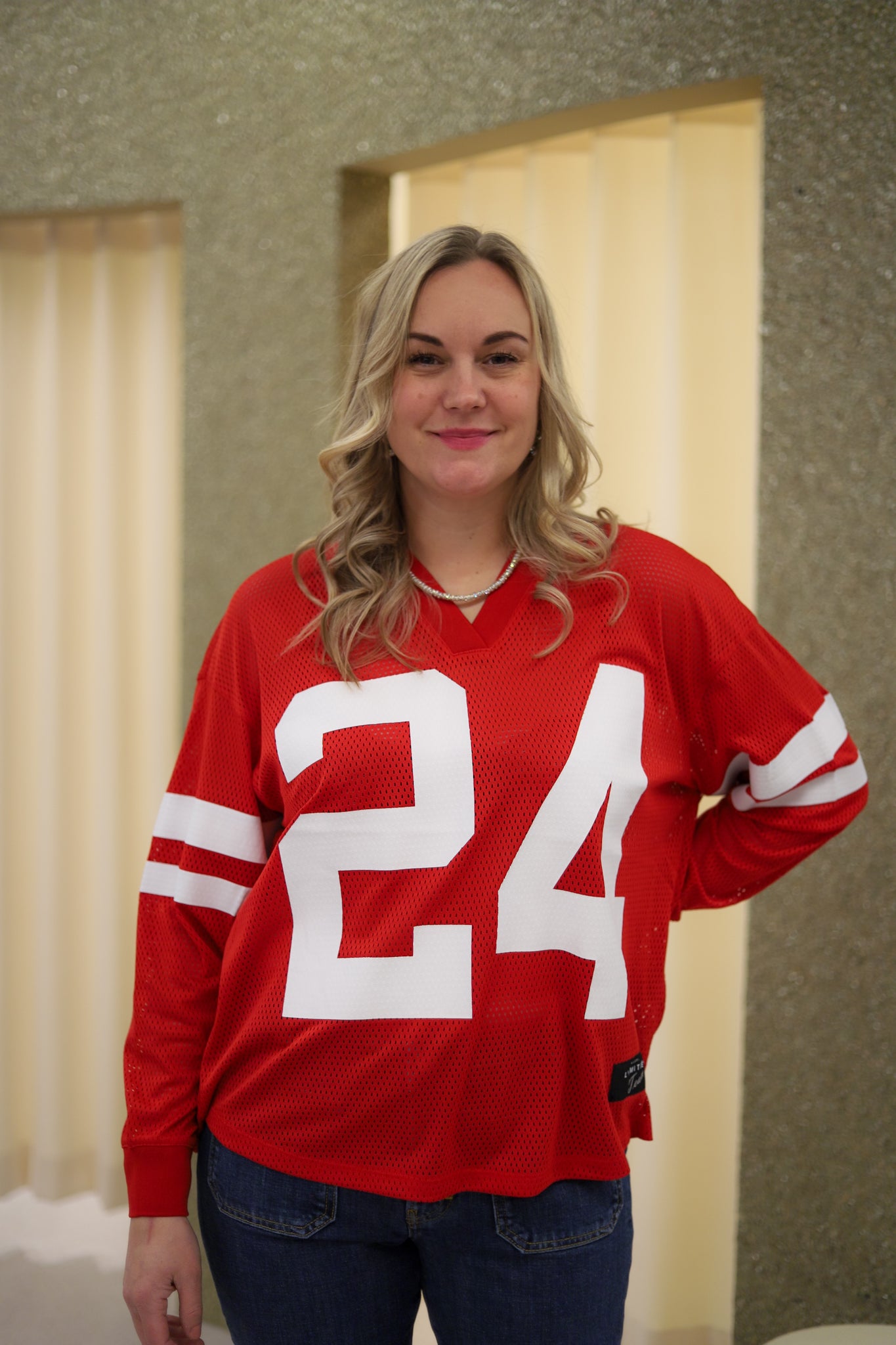 Kul topp i rød med nettingstruktur fra Haute L'Amitié. Modellen er oversized med v-hals. Den har lange ermer med ribb i mansjett og droppet skulder. Stor hvitt 24-tall i front. En avslappet topp med sporty uttrykk. Perfekt for lag-på-lag eller alene for en lett og luftig følelse.