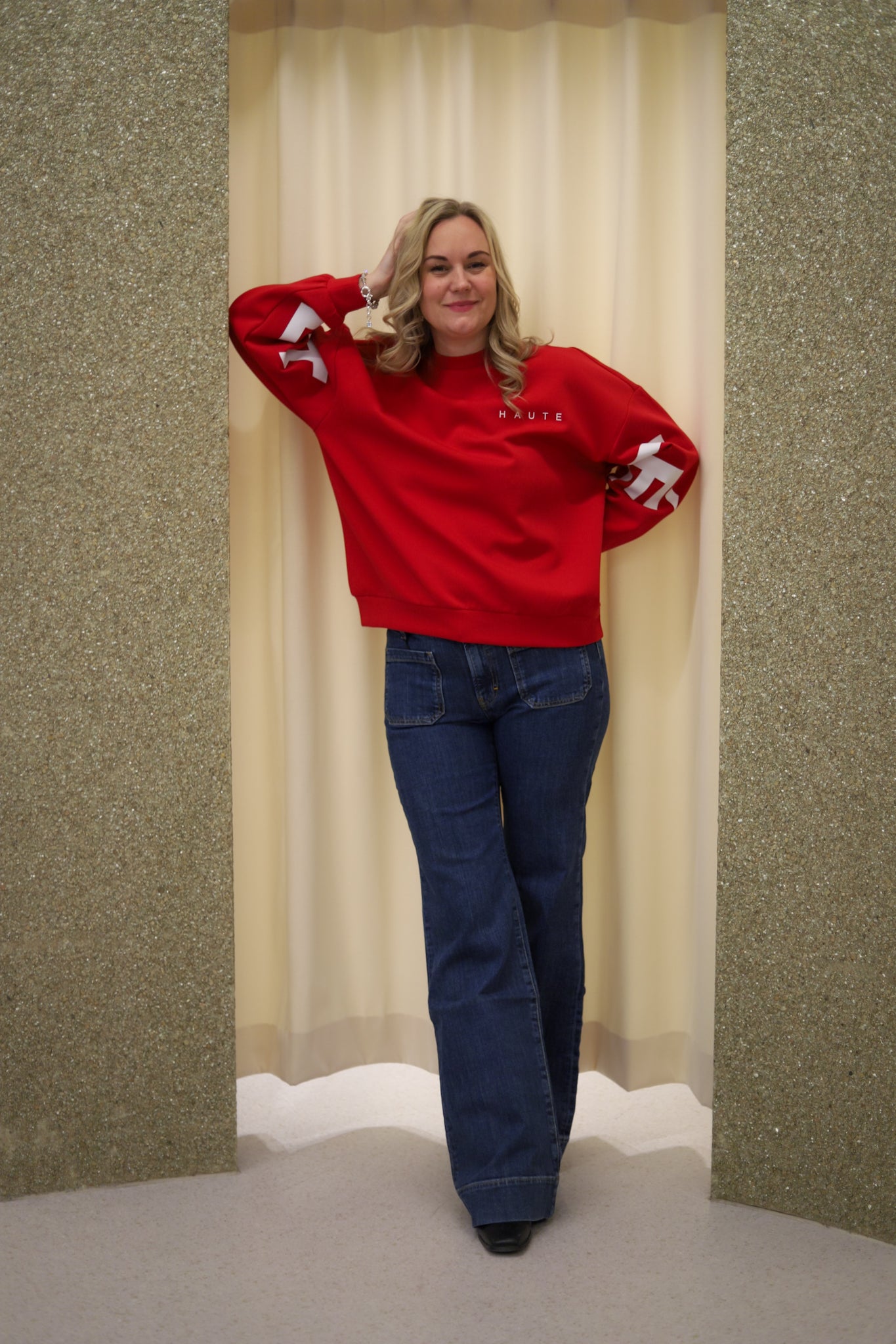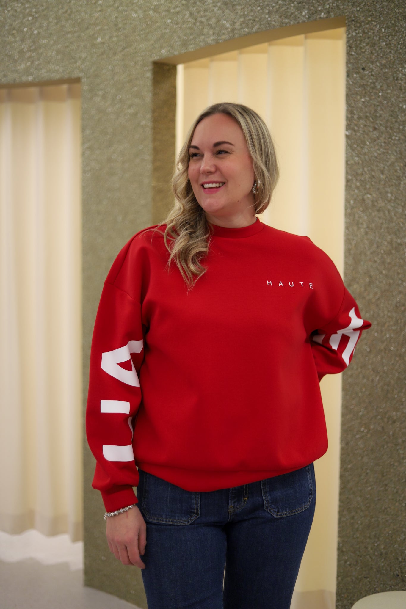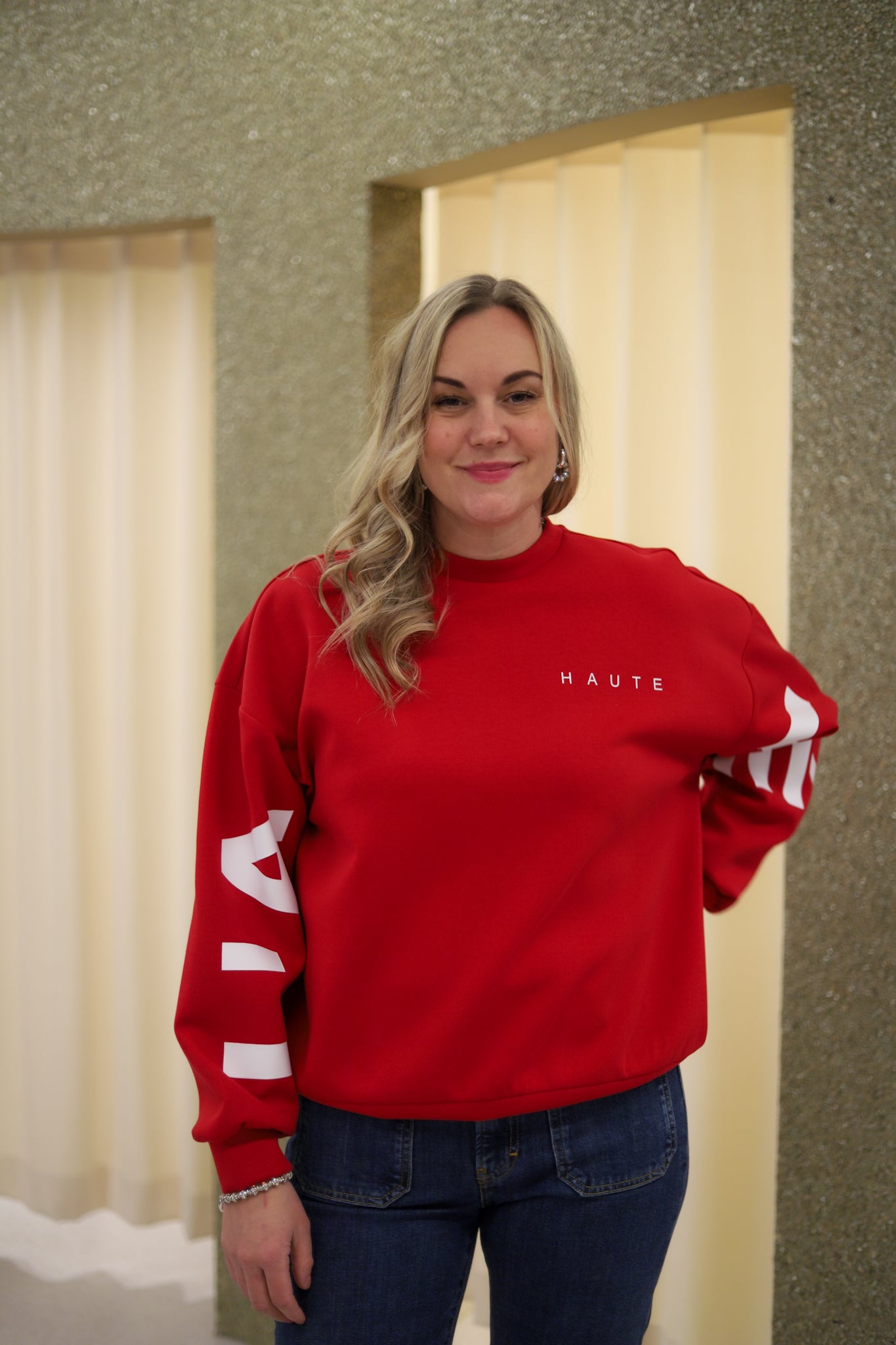 Stilig sweat i rød fra Haute L'Amitié. Modellen er oversized med rund hals og lange ermer med droppet skulder. Genseren har ribb i hals, hem og mansjett. Liten logo på vestre bryst og store logobokstaver i hvit langs ermene og på ryggen.