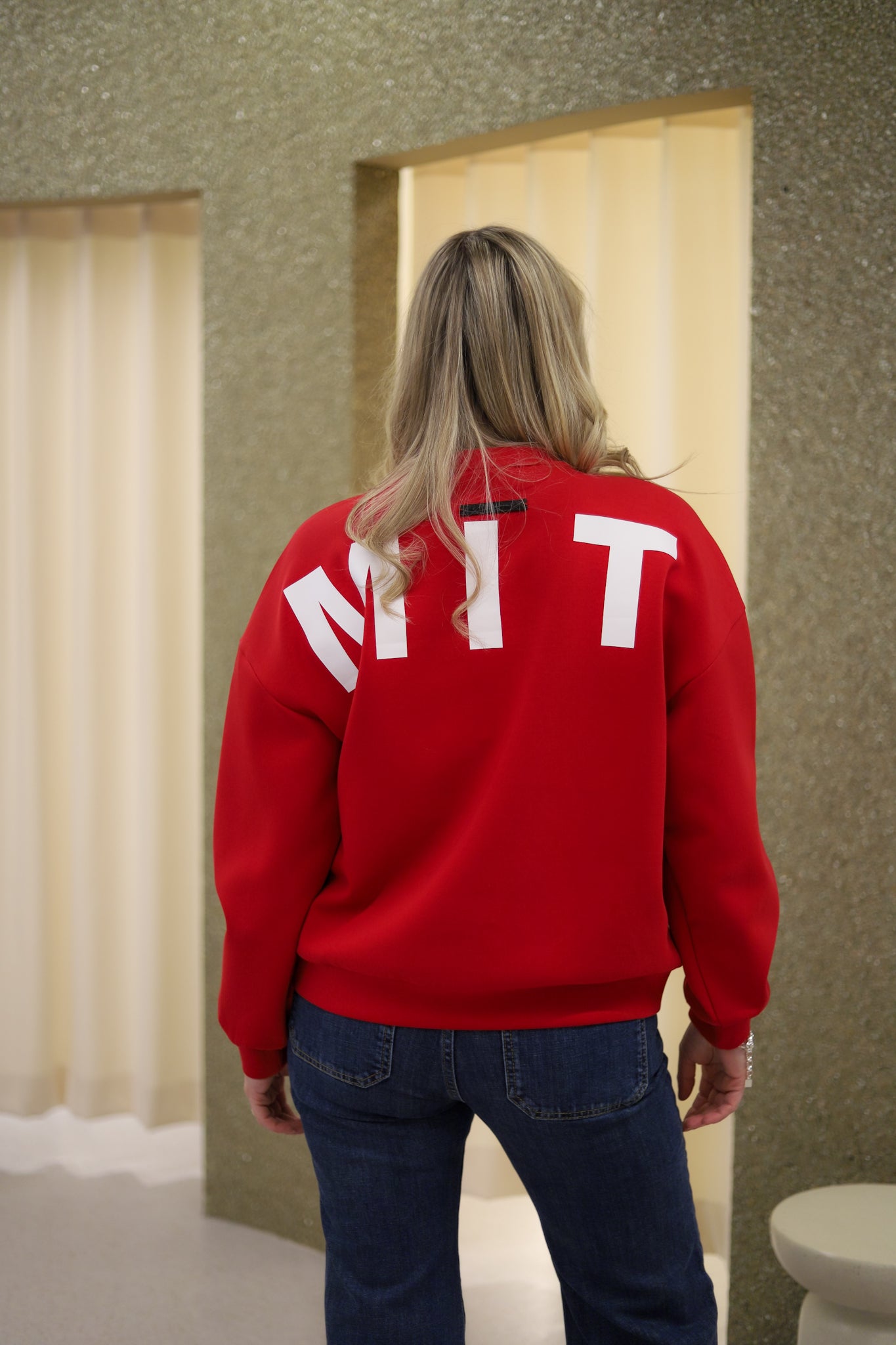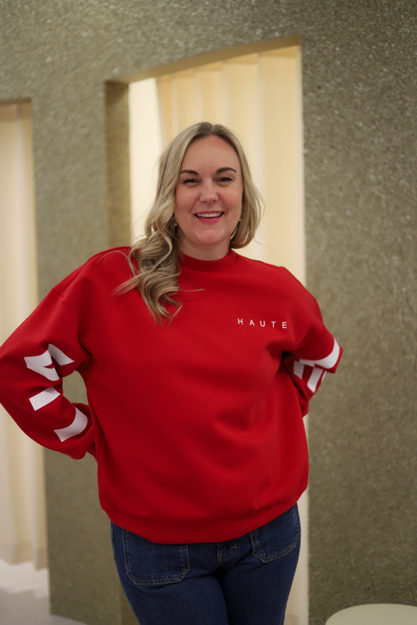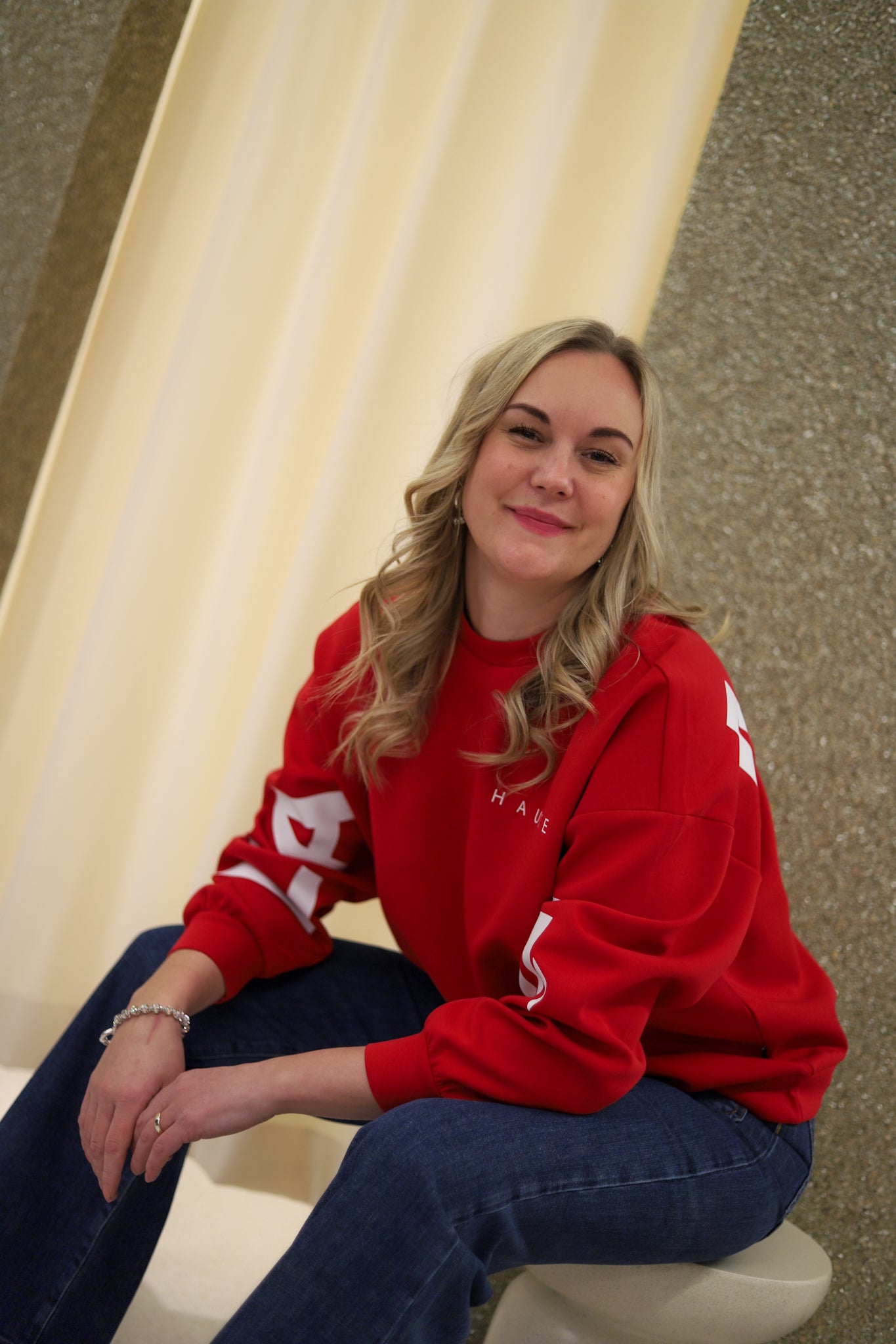 Stilig sweat i rød fra Haute L'Amitié. Modellen er oversized med rund hals og lange ermer med droppet skulder. Genseren har ribb i hals, hem og mansjett. Liten logo på vestre bryst og store logobokstaver i hvit langs ermene og på ryggen.