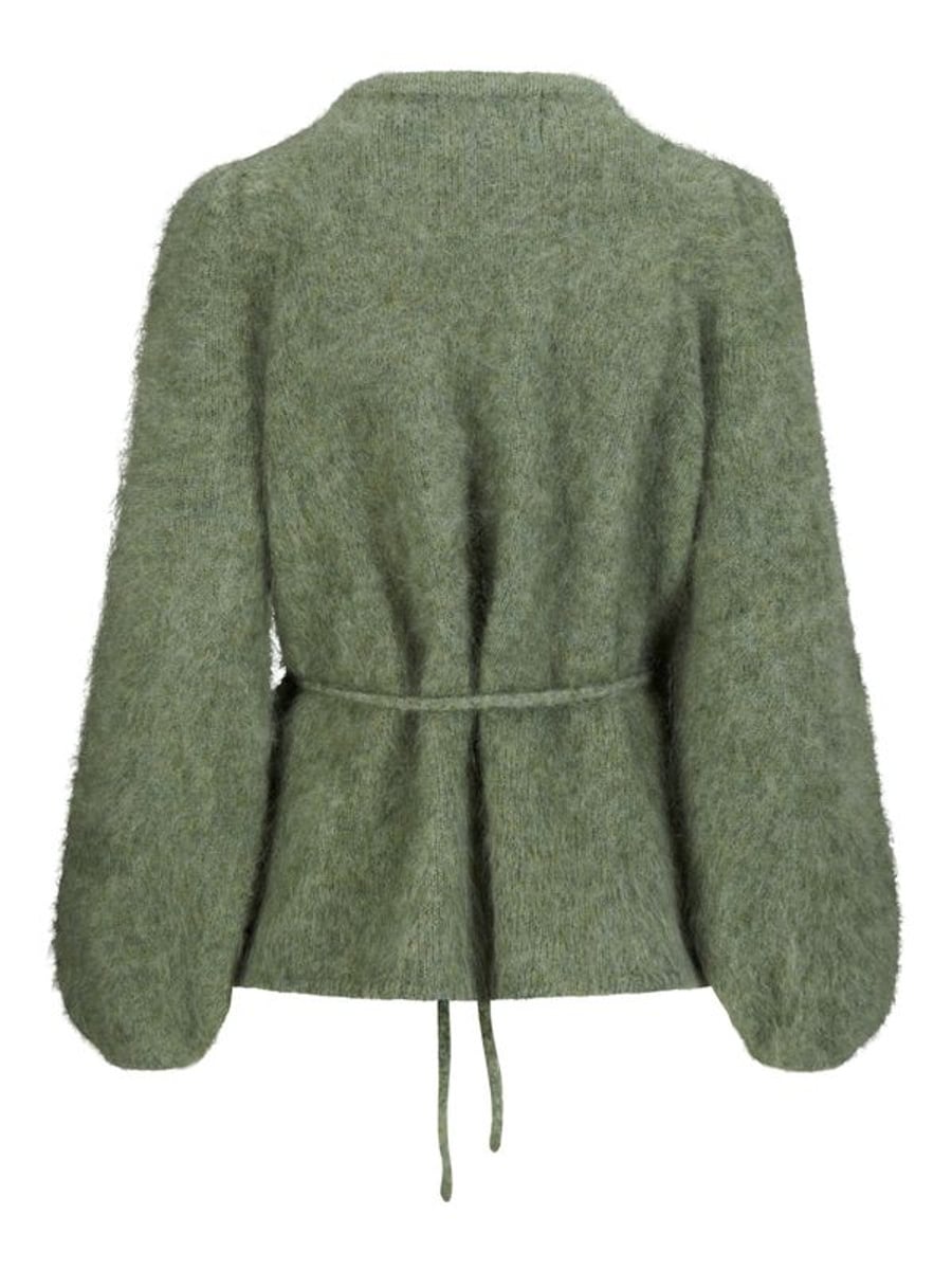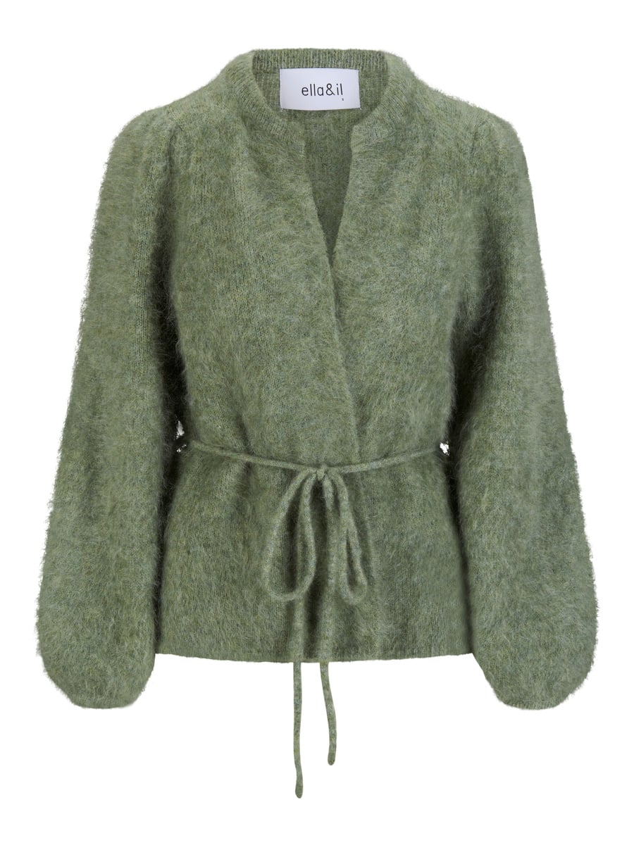 Superlekker chunky cardigan fra norske Ella&il. Modellen er smal med hoftelenge og avtagbart bånd i midjen. Rund hals med v- utringning og omslagseffekt. Lange delikate ballongermer. Delikat børstet kvalitet i en nydelig grønnfarge. Feminin cardigan i deilig mohairblanding. Superfin over kjole, skjørt og til bukse.