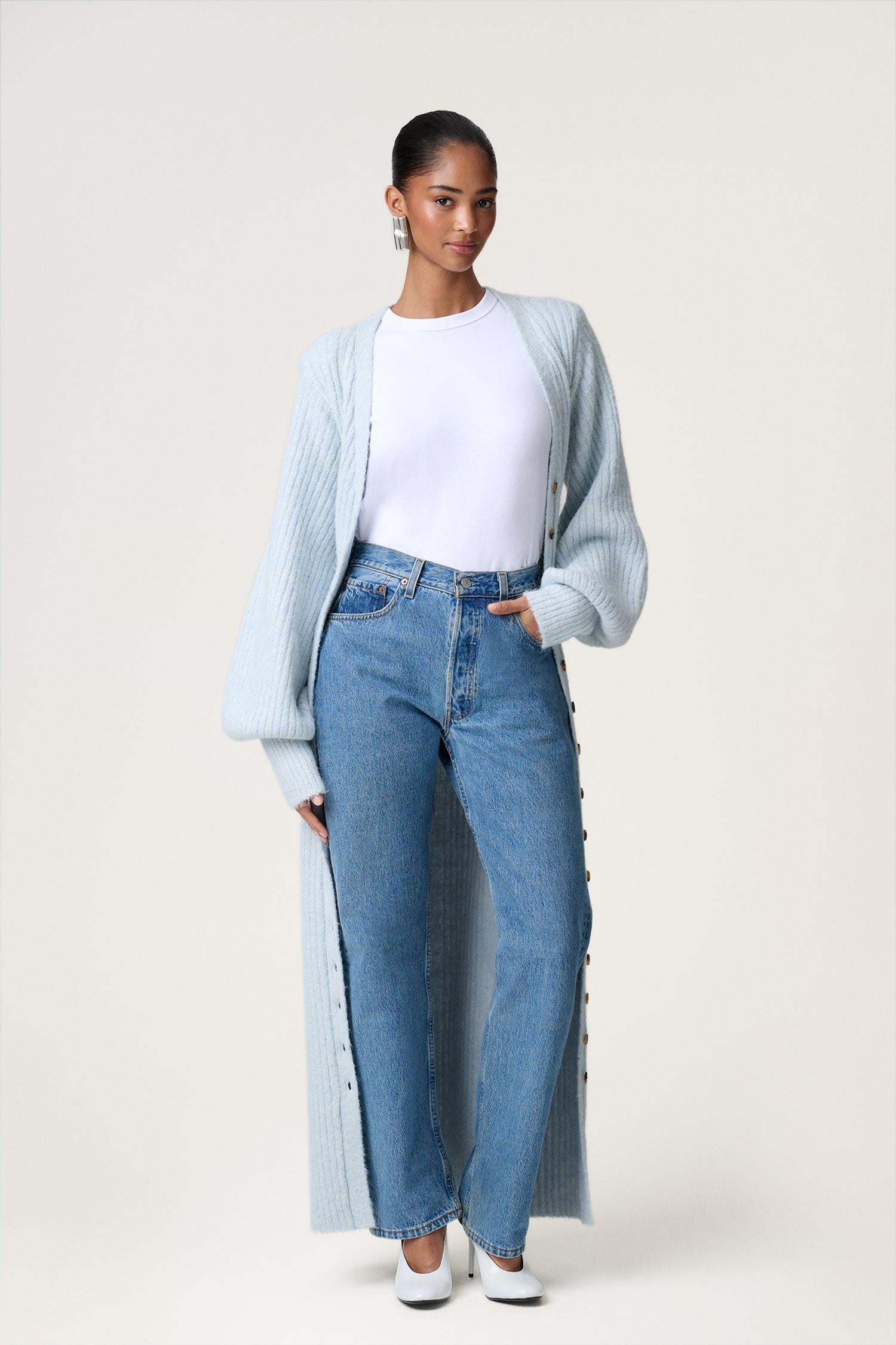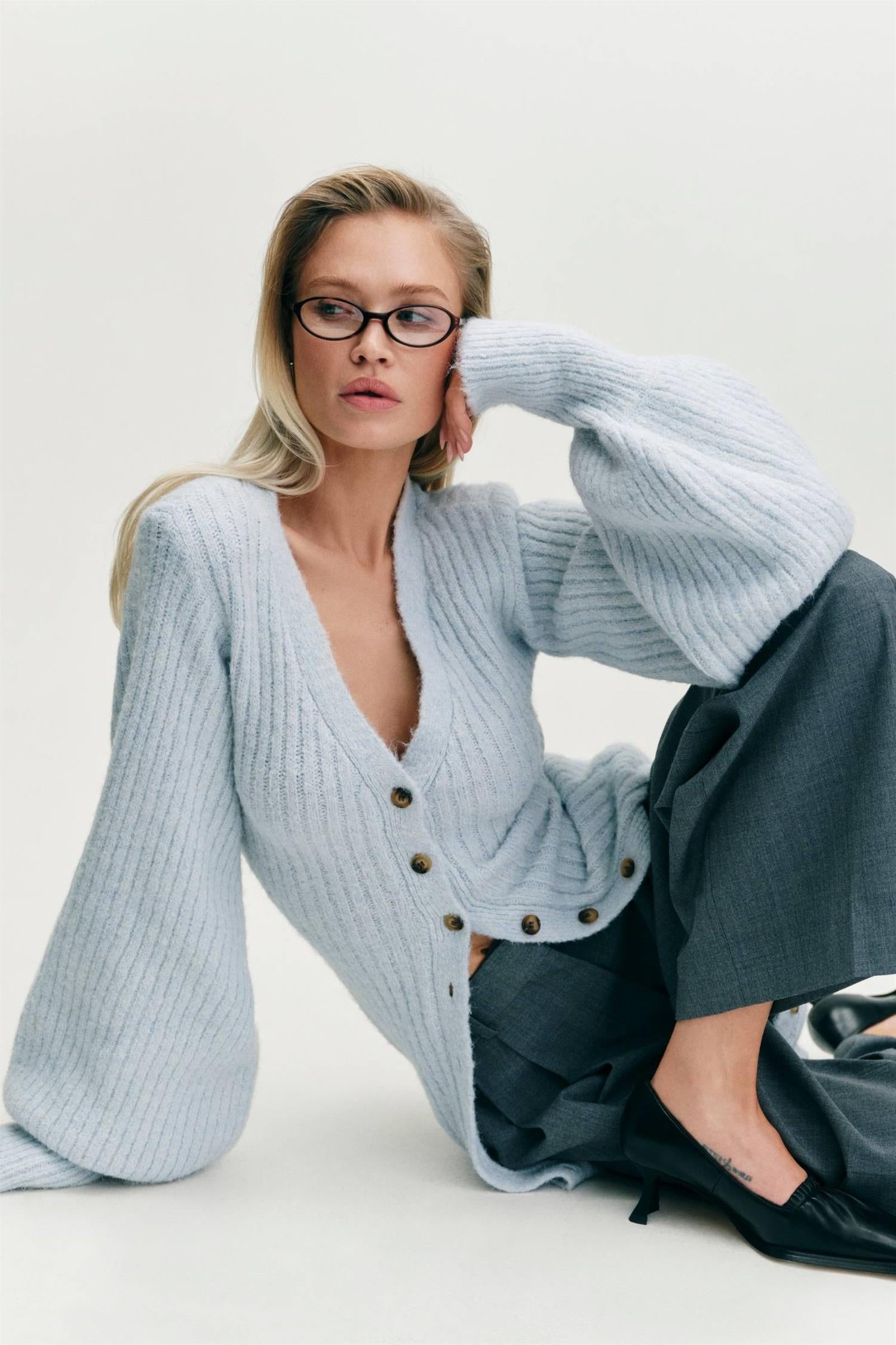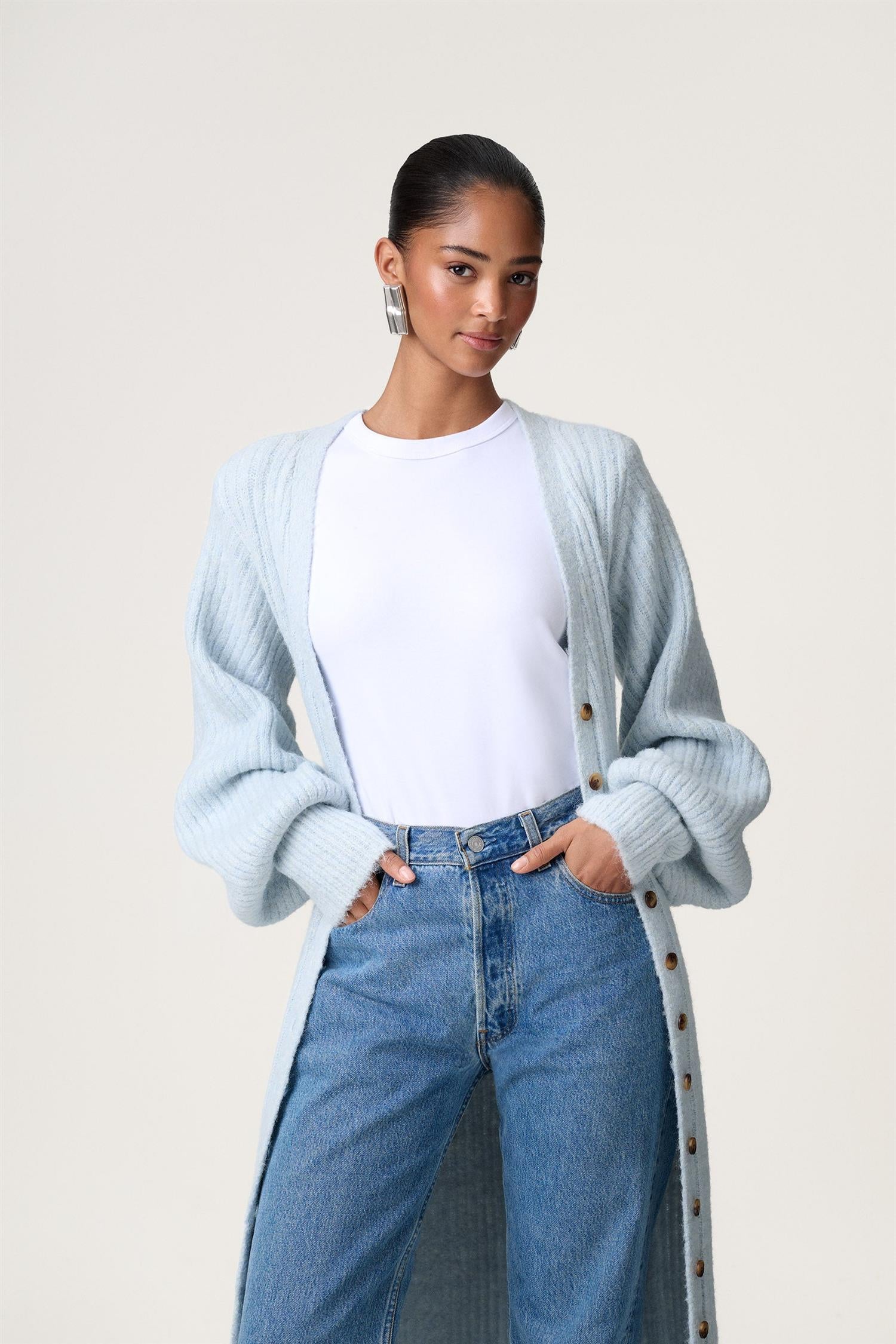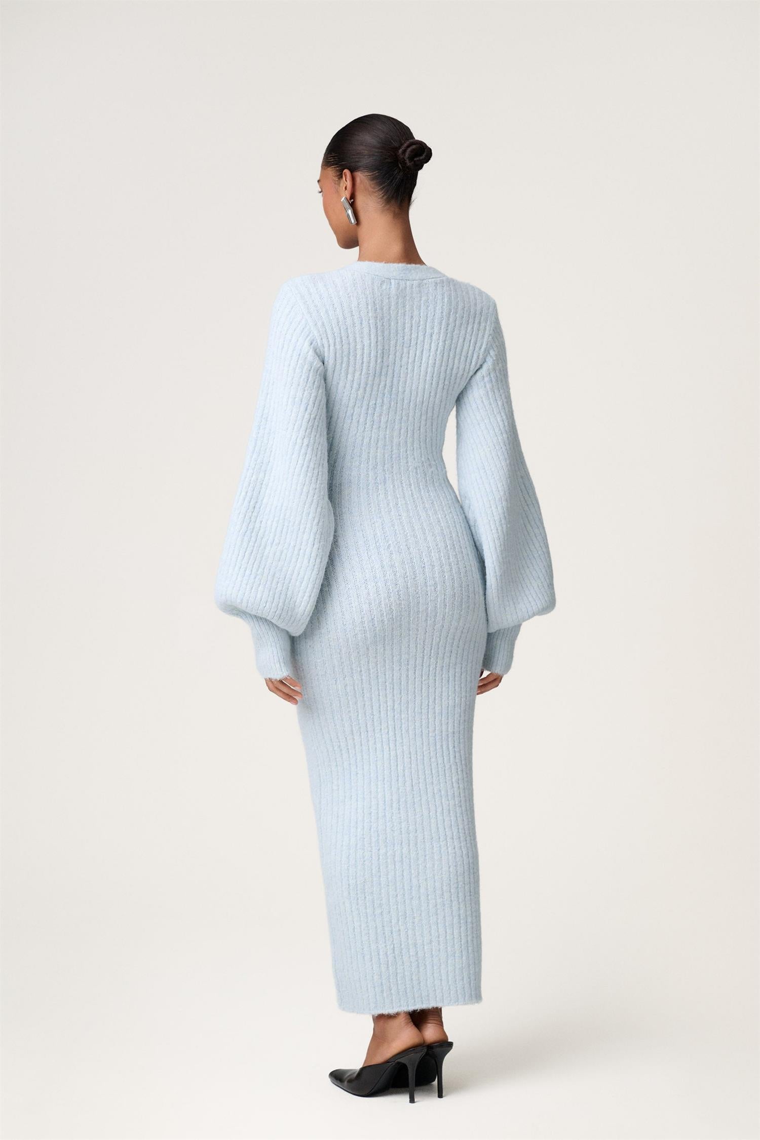 Maxikjole i lys blå ribbestrikk fra Adoore. Modellen er tettsittende med timeglasspassform, lange voluminøse ermer med bred mansjett og dyp V-hals. Trendy kjole som er like fin åpen som cardigan!