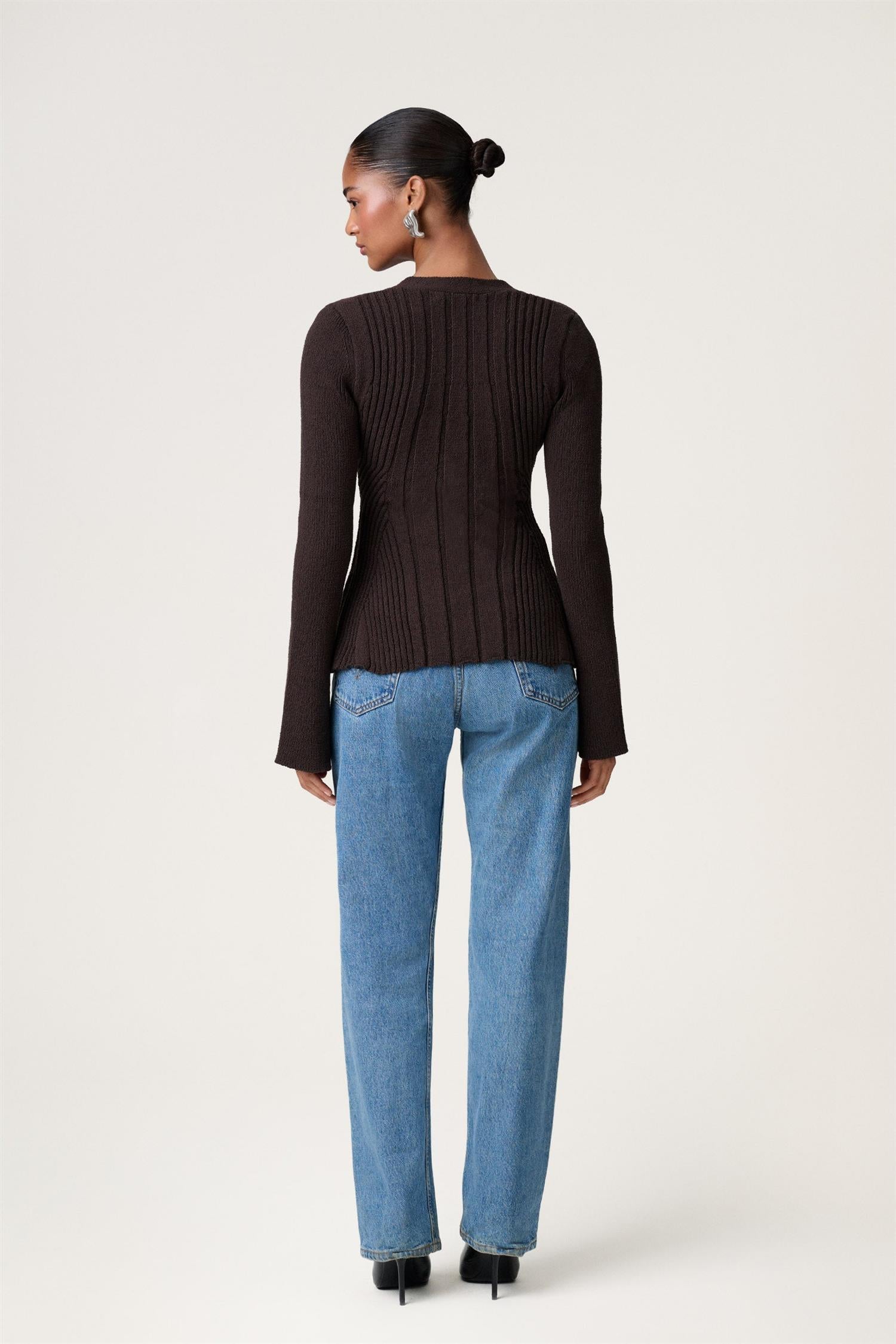 Lekker cardigan i mørk brun fra Adoore. Modellen er tettsittende med definert midje for en elegant silhuett. V-hals og lange ermer som skrår ut brede mansjetter og strukturerte skulderputer. Lekker over kjoler og til jeans.