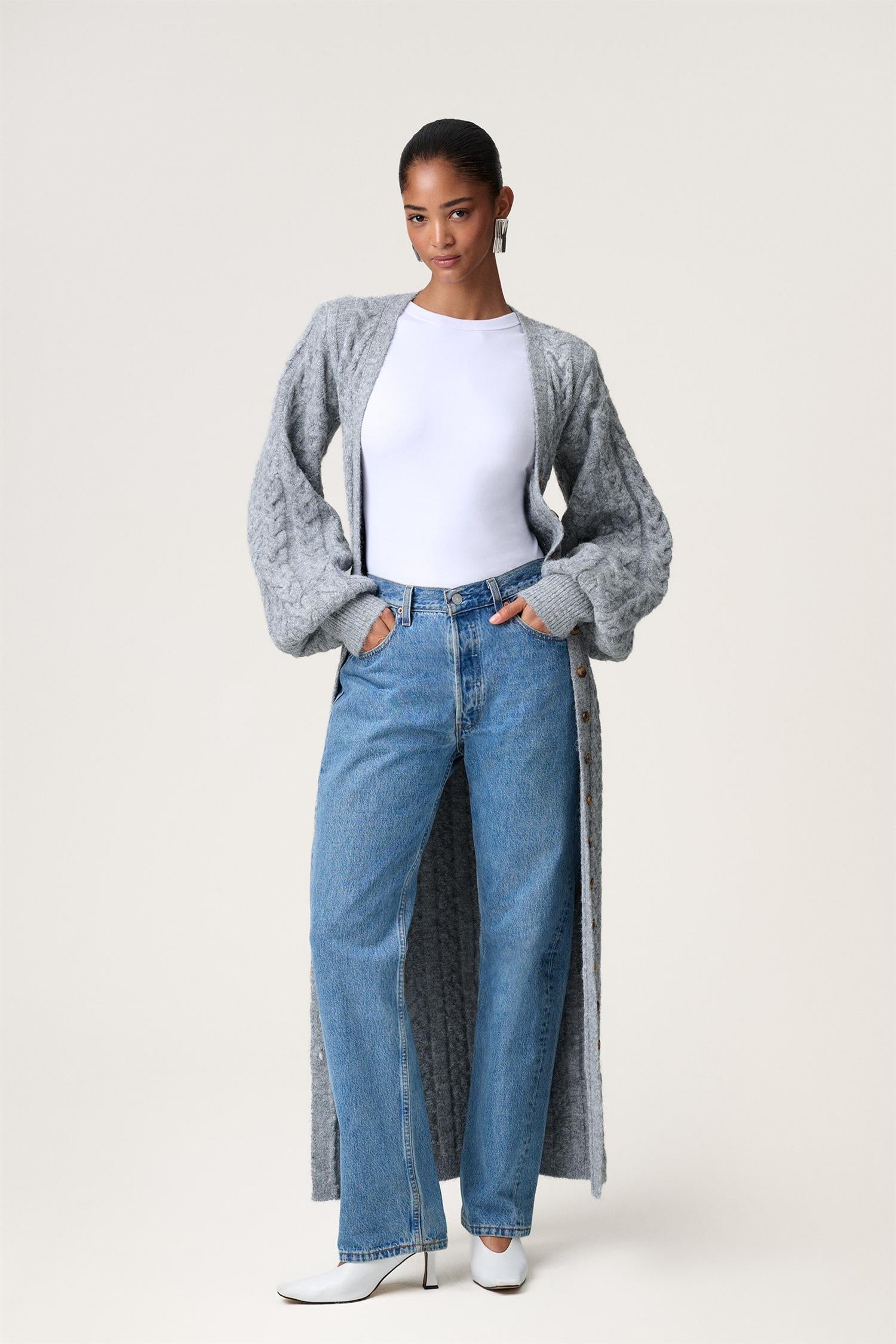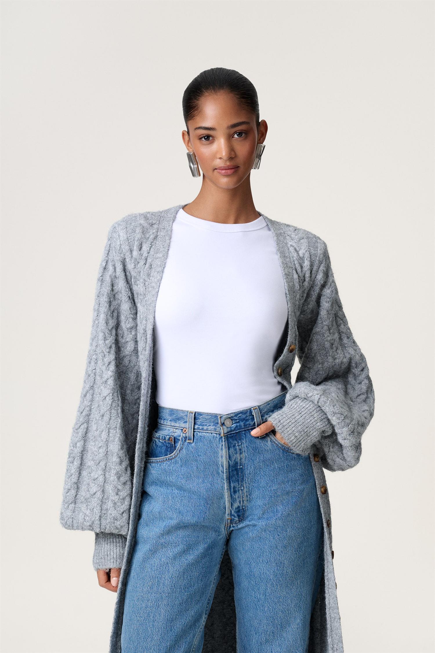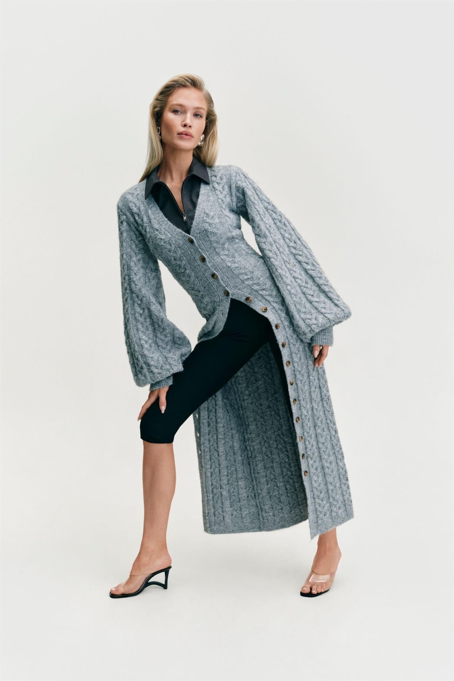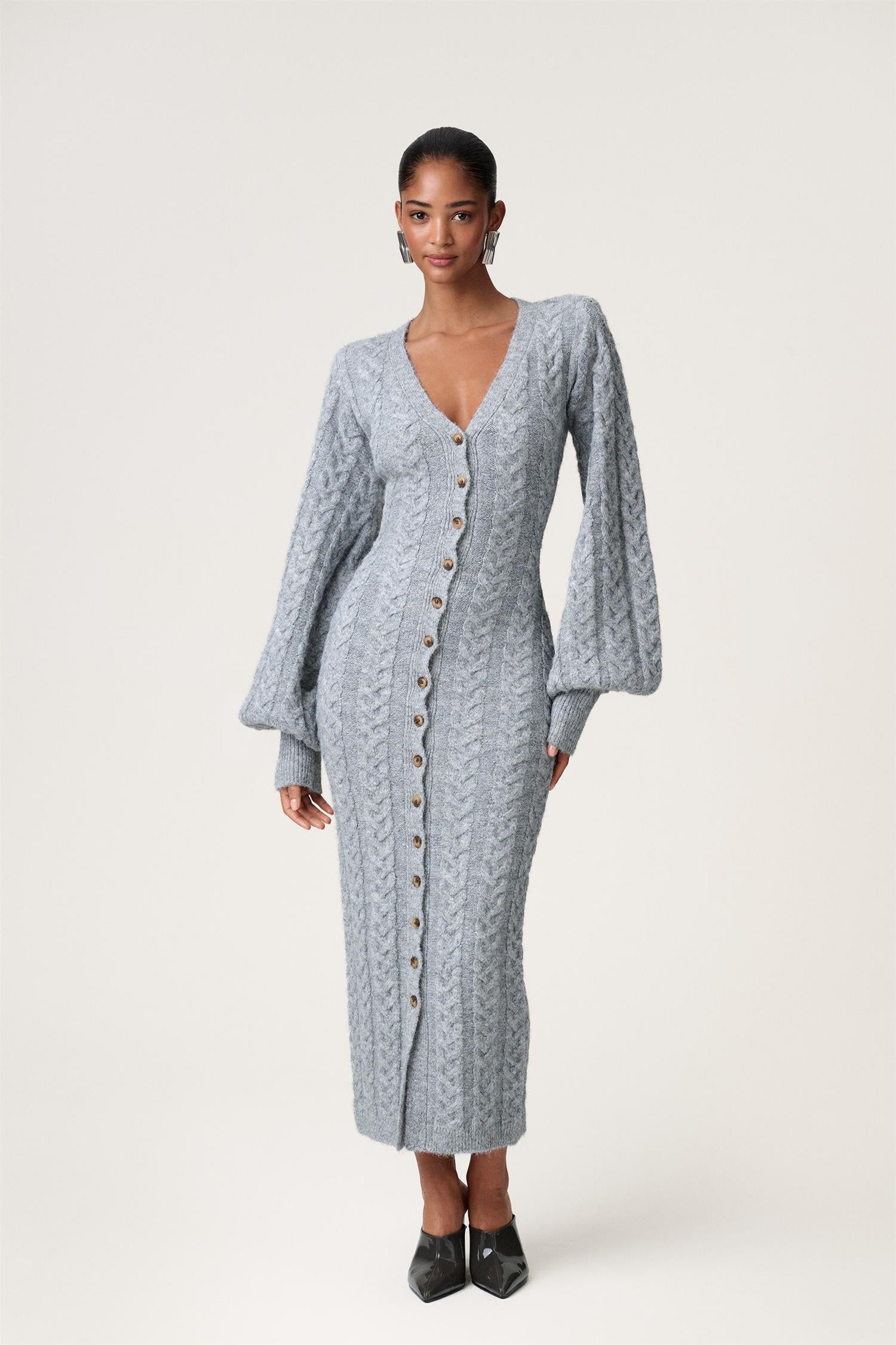 Maxikjole i grå flettestrikk strikk fra Adoore. Modellen er tettsittende med timeglasspassform, lange voluminøse ermer med bred mansjett og dyp V-hals. Trendy kjole som er like fin åpen som cardigan!