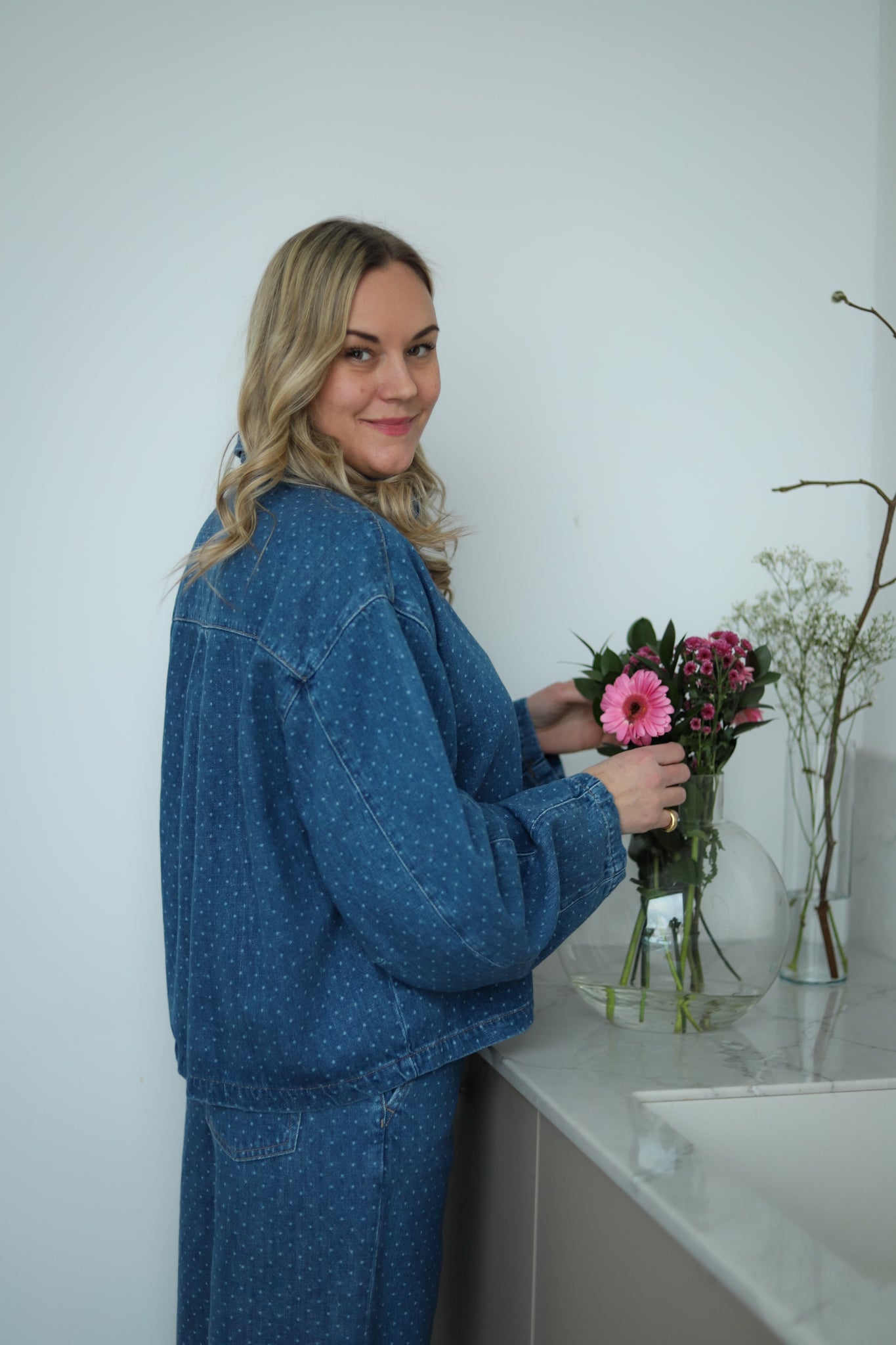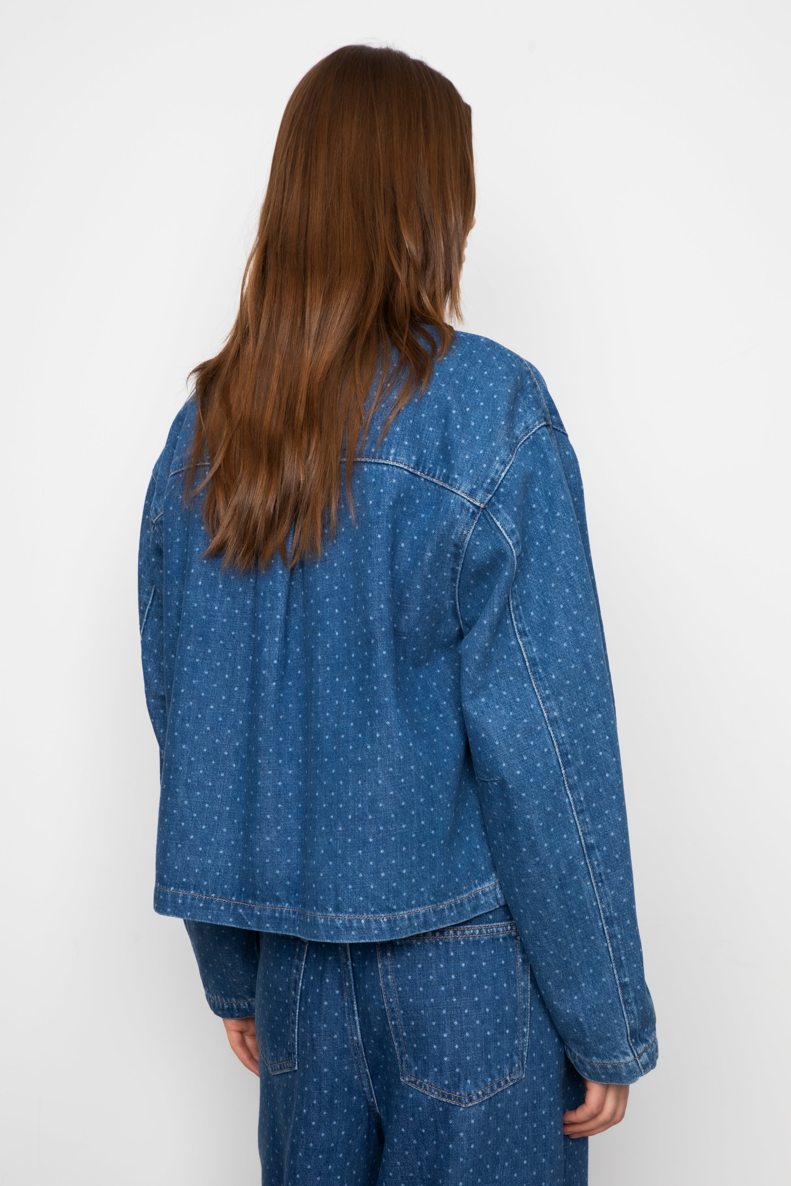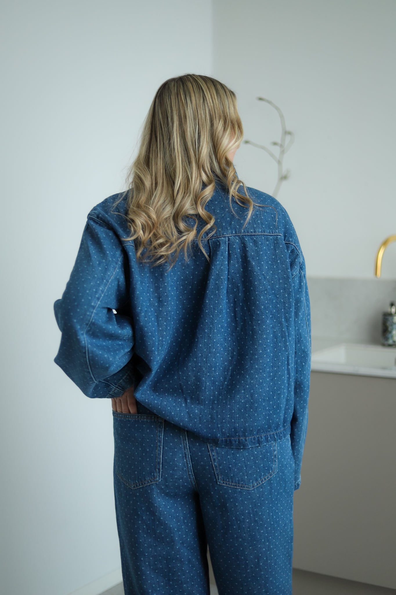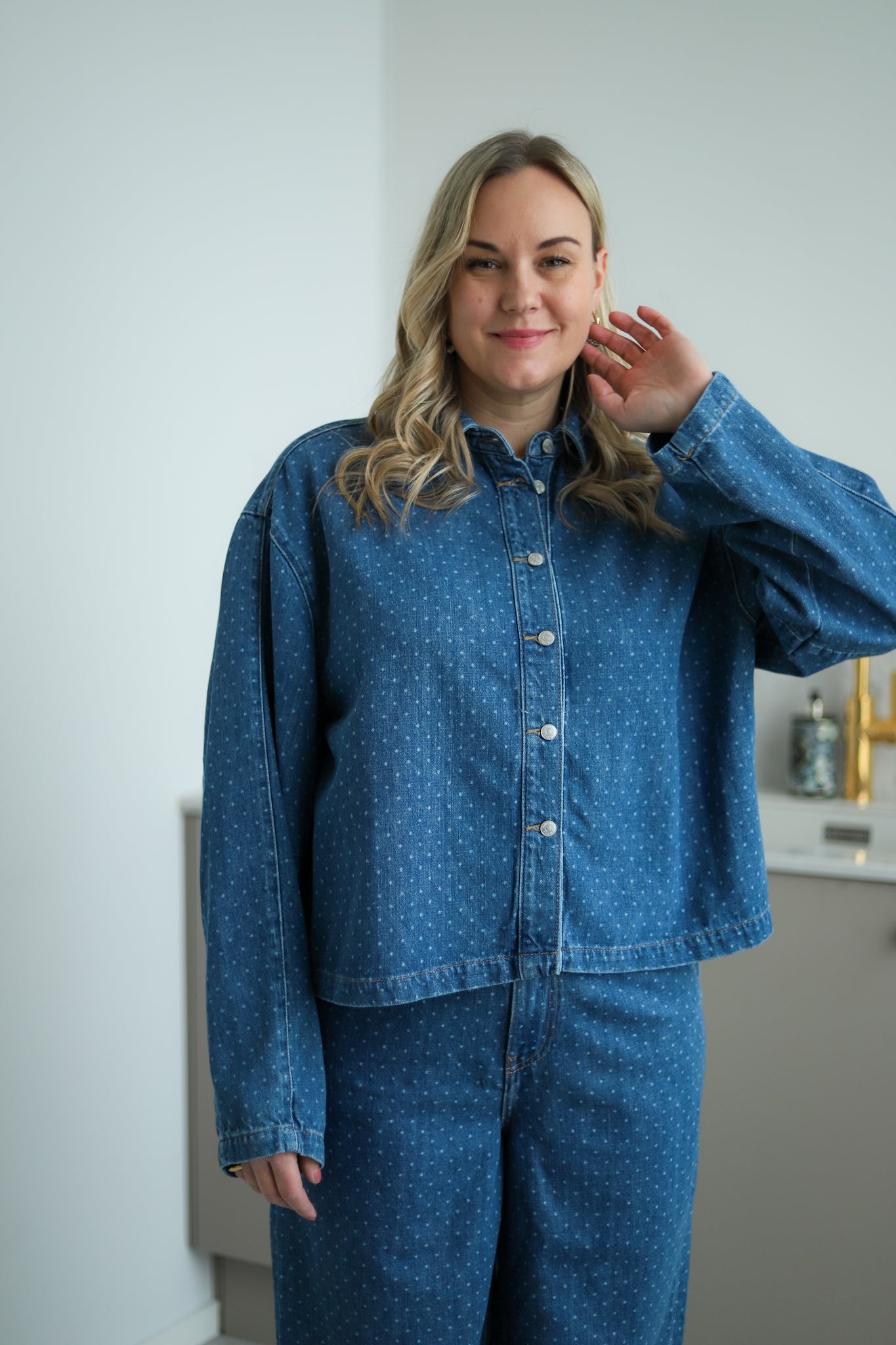 Stilig denimskjorte med lyse prikker fra Camilla Pihl. Modellen er rett med lett cropped lengde og klassisk knappelukking. Den har skjortekrage, droppet skulder og lange ermer. Sesongens lekreste denimsett! Style skjorten med matchende bukse for komplett look.