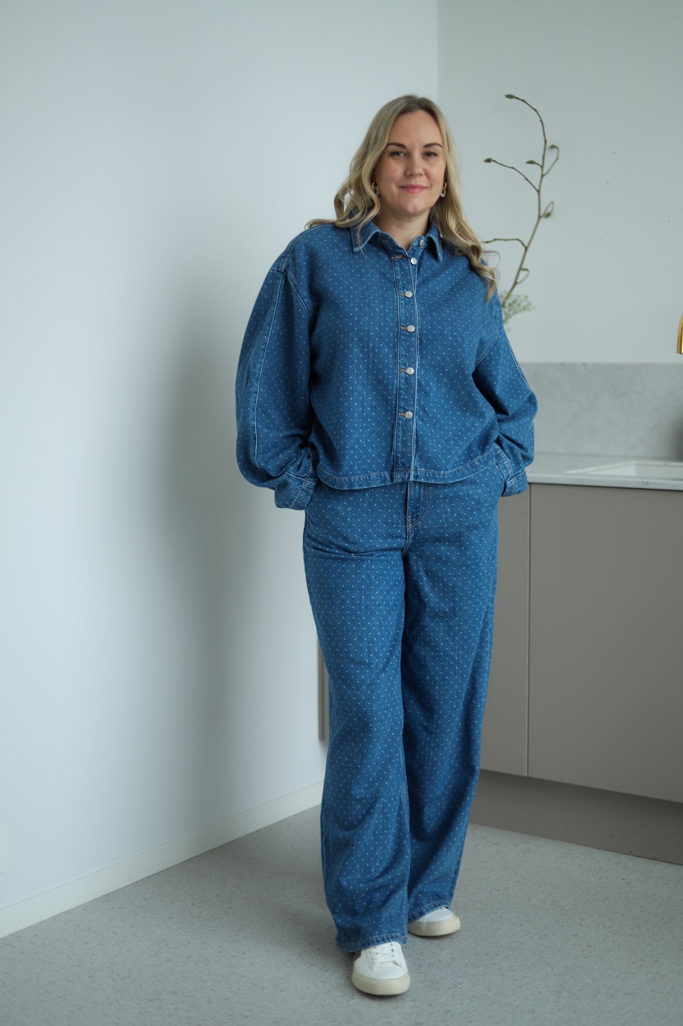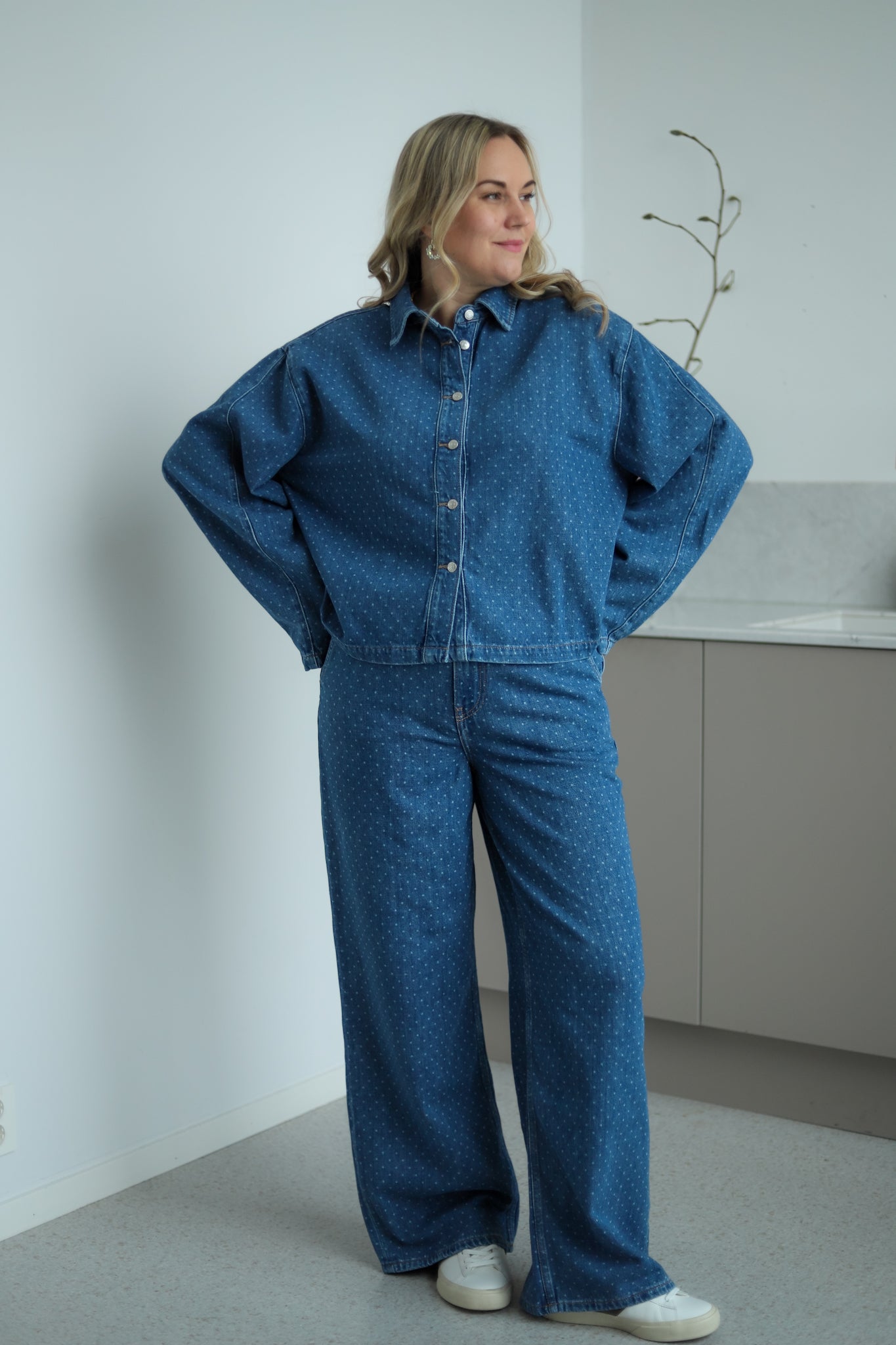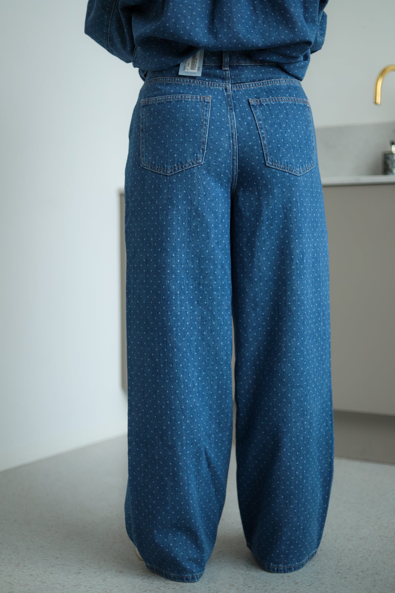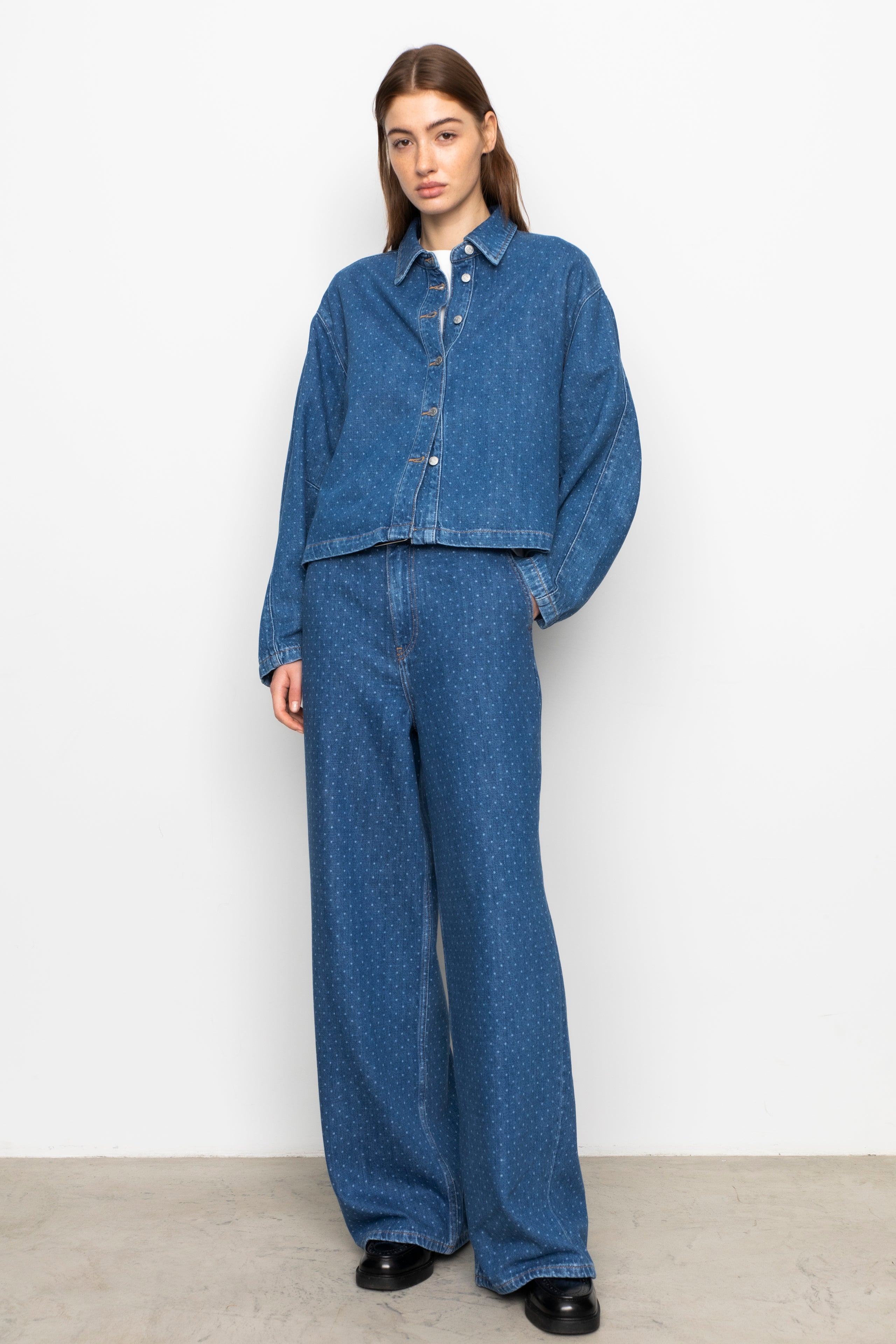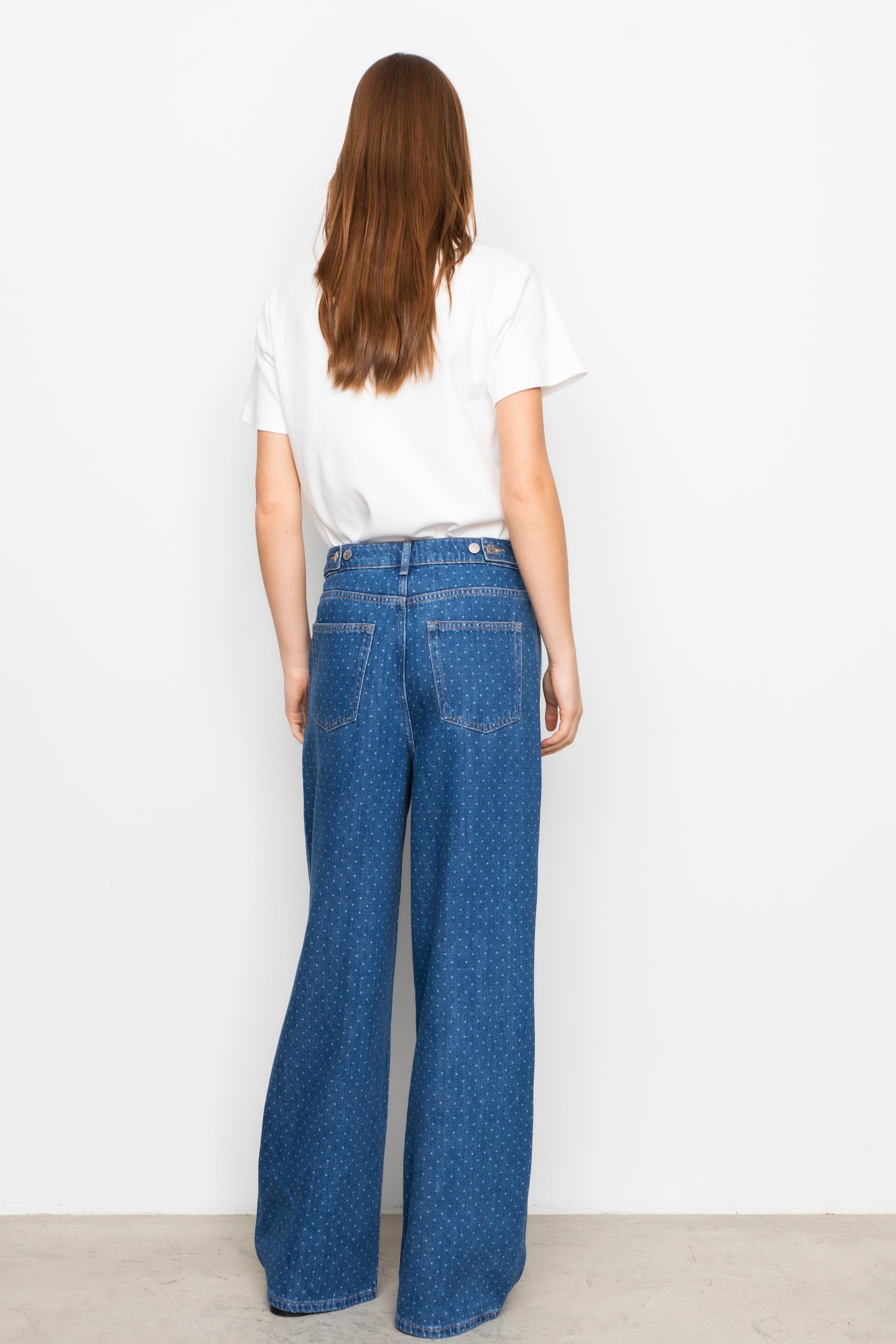 Stilige jeans med lyse prikker fra Camilla Pihl. Modellen har rette ben og medium høyde på livet. Den har stikklommer i siden, patchlommer bak, beltehemper og justerbar livvidde med knapper i sidene. Lukkes med glidelås og knapp i front. Style jeansen med matchende skjorte for komplett look.