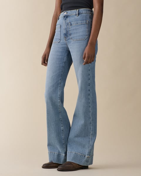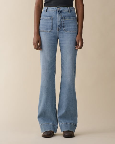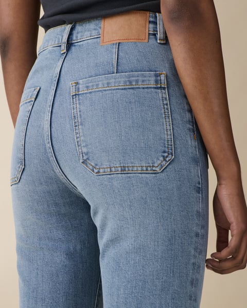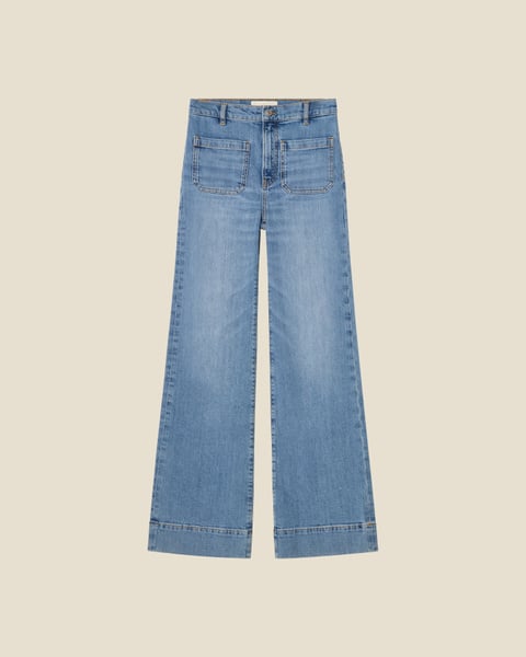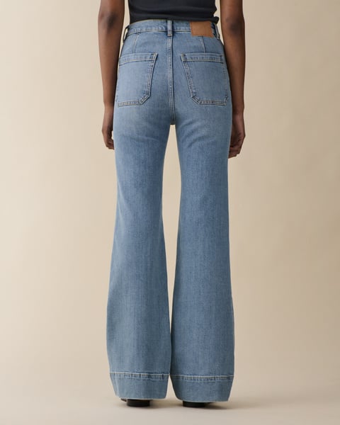 Favoritten St Monica i en lys vintageinspirert vask fra Jeanerica. Modellen er seiler inspirert med høyt liv, lange ben med flare og har en kul bred kant nederst. Den har 70-talls patchlommer foran og bak, linning med beltehemper, gylf med skjult glidelås og knapp. Perfekt jeans med sesongens fineste vask!