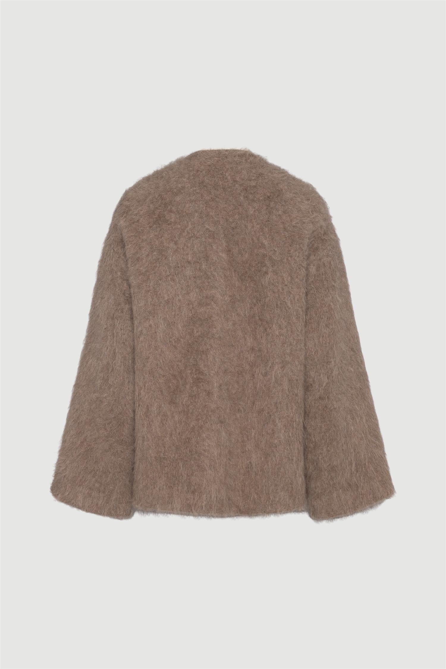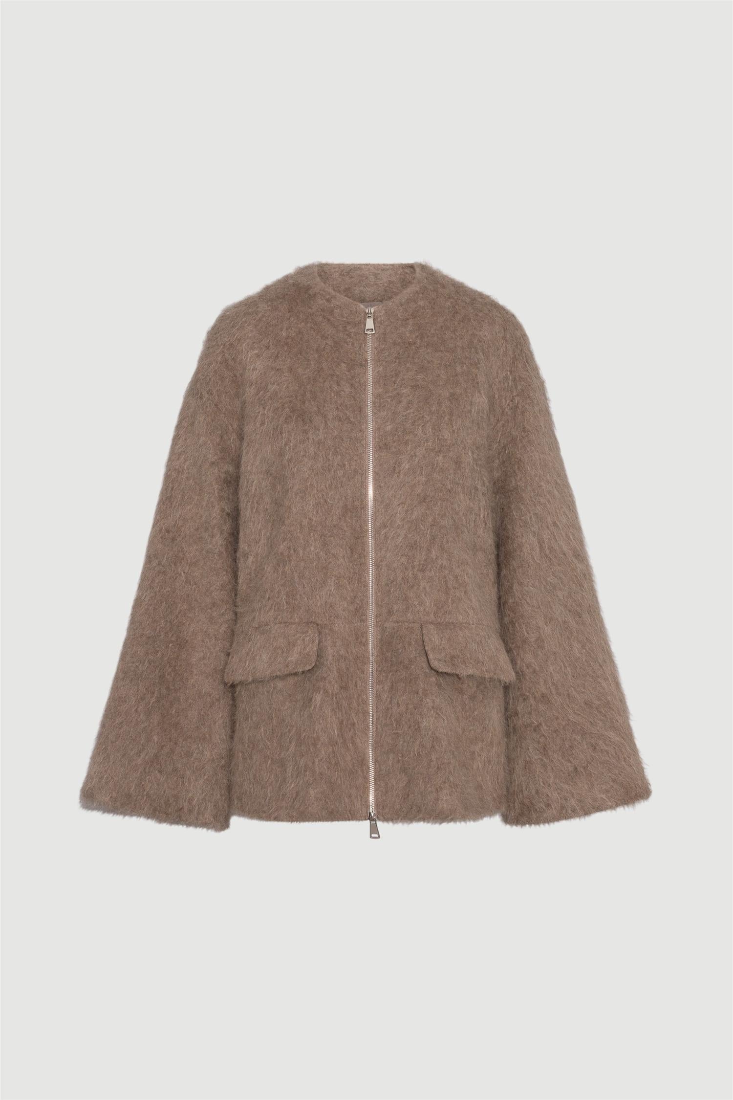Elegant jakke i lys brun ullkvalitet fra Envelope 1976. Modellen er rett med rund hals, glidelåslukking og lange vide ermer. Den har klafflommer i front og balanserer komfort og eleganse uanstrengt. Stilren og eksklusiv jakke, perfekt for lag-på-lag-bruk gjennom overgangssesongene.