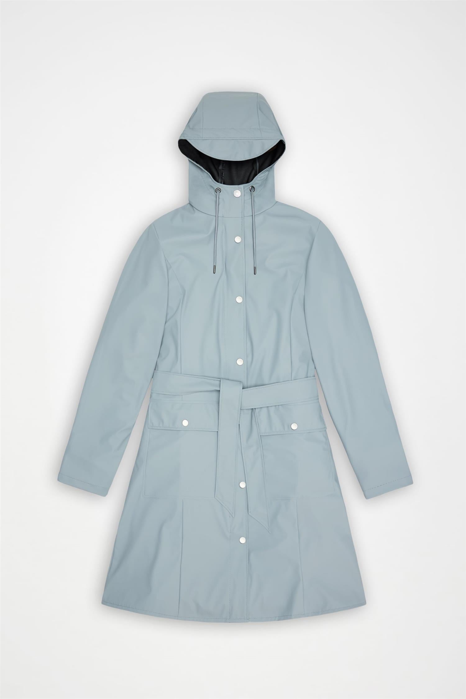 Vanntett regnjakke i deilig myk kvalitet fra Rains. Trenchcoat stil, med a-fasong og knytebelte i livet. Jakken er lett i vekt og har en flott matt finish. En jakke med høy funksjonalitet kombinert med et feminint og minimalistisk design. Glidelås med stormklaff lags fronten og hette med brem og snøring. Klafflommer i hoftehøyde og justerbare mansjetter. Jakken er vanntett, vindtett, har sveisede sømmer og ventilering under armene. Her i lys blå farge. Perfekt urban og trendy jakke på farten, uansett vær!