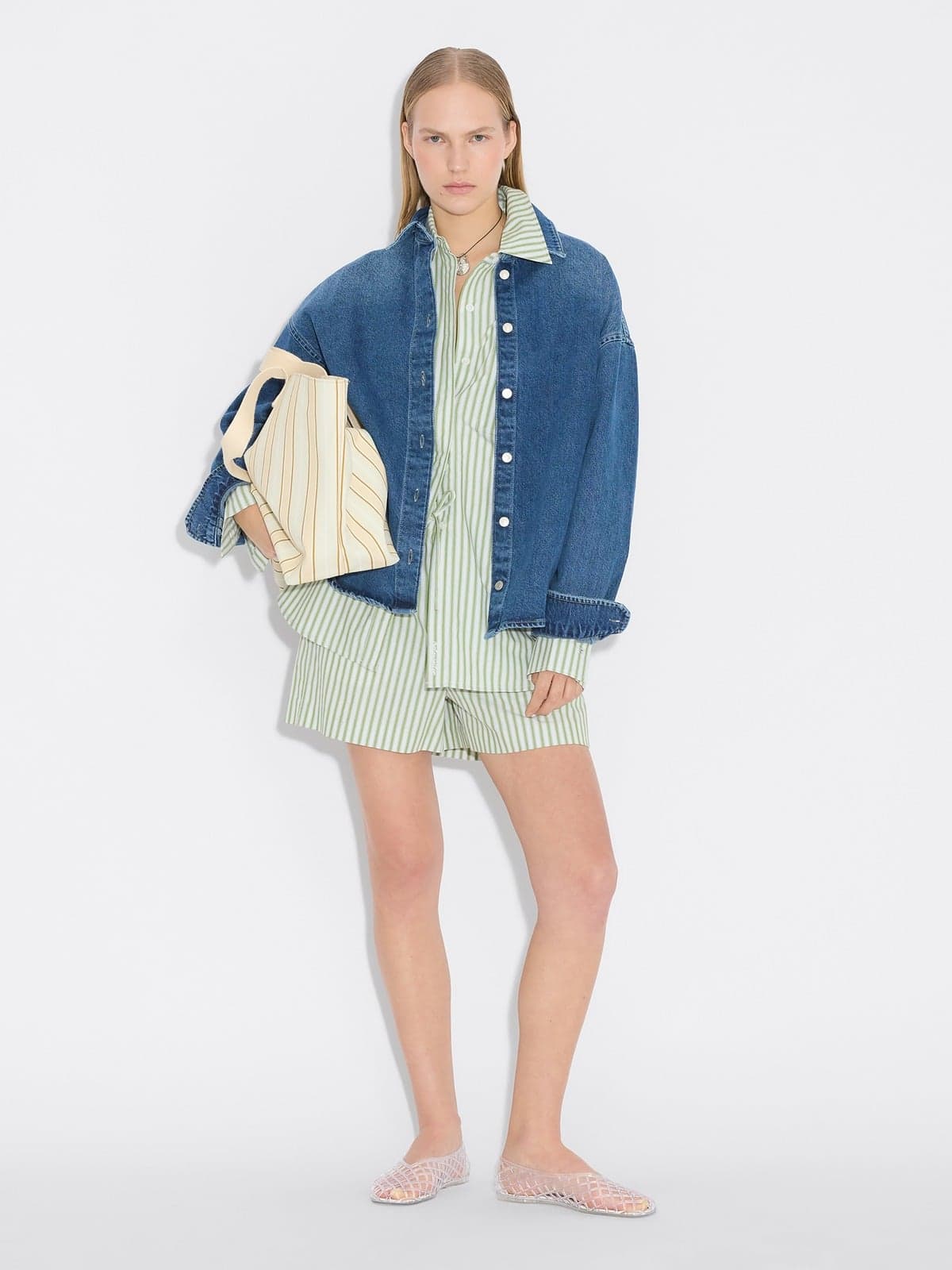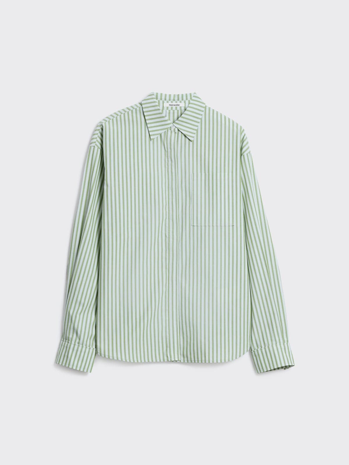 Stilig skjorte i lys grønn med off-white striper fra Holzweiler. Modellen er oversized med klassisk skjortekrage og skjult knappestolpe i front. Den har god lengde med lett buet hem og diskret patchlomme på brystet. Lange ermer med droppet skulder og knapper i mansjett. En avslappet bomullsskjorte med heldekkende stripemønsteret som utstråler klassisk og tidløs eleganse. Style den med en lys jeans eller shorts og sesongens lekreste sneakers.