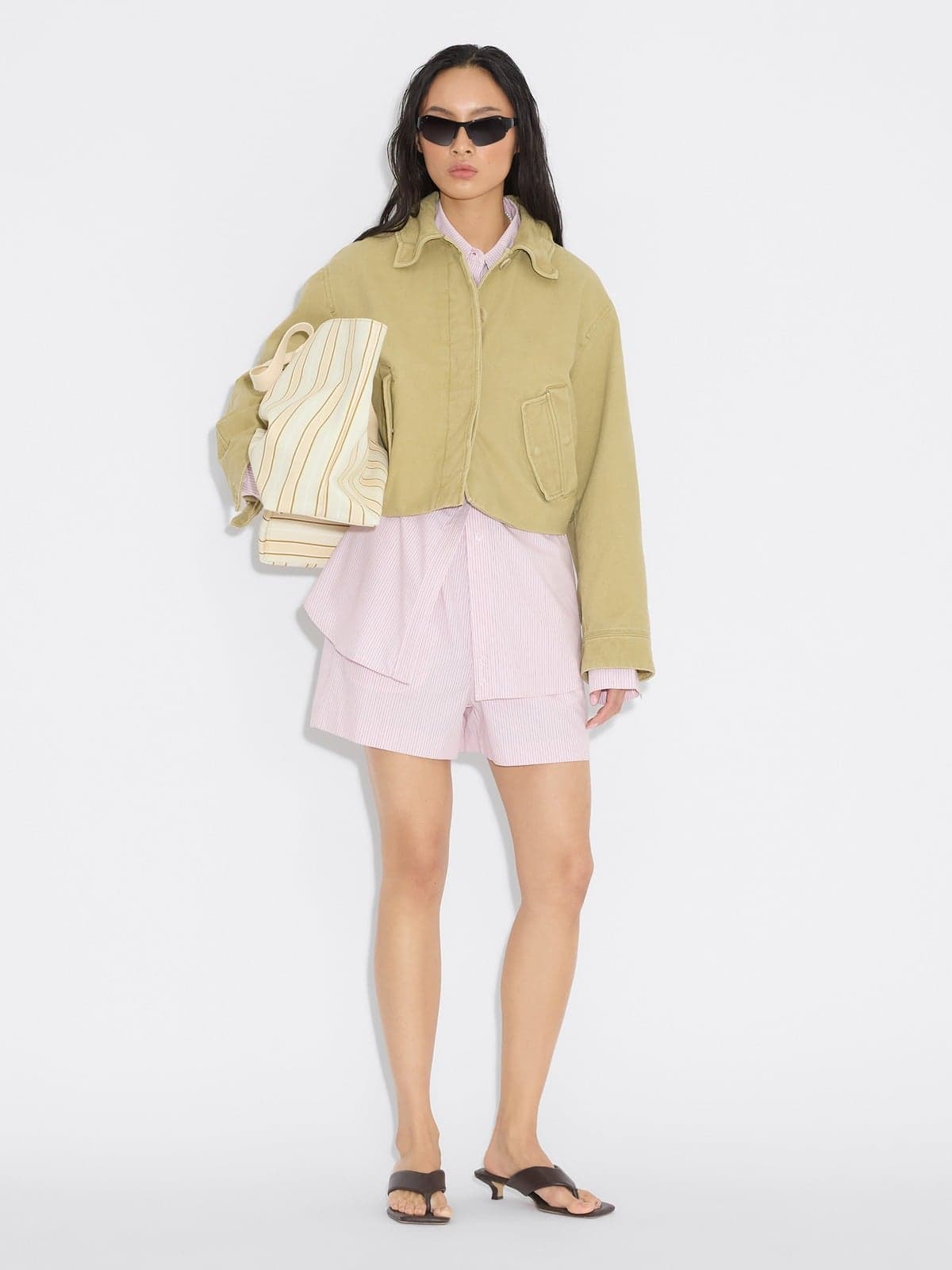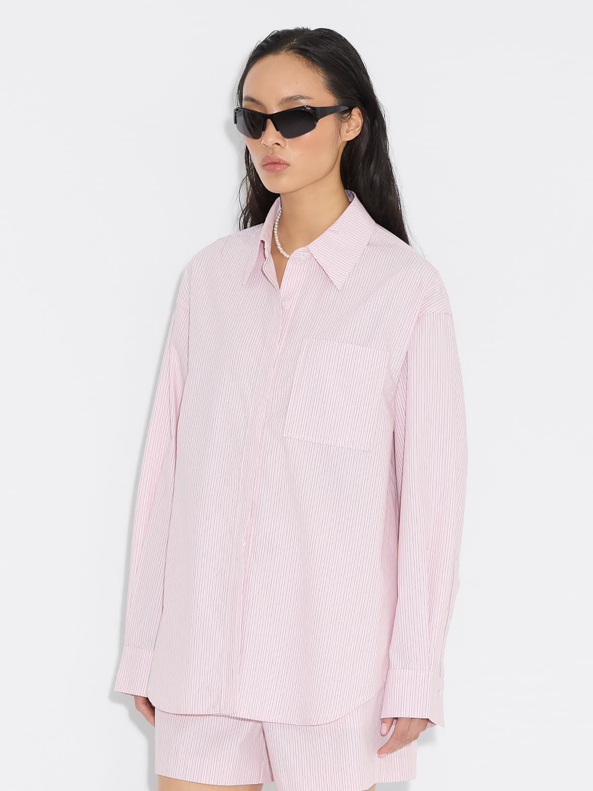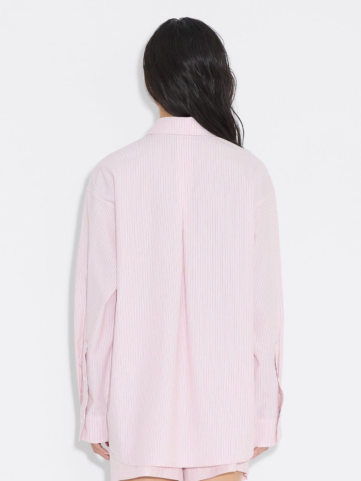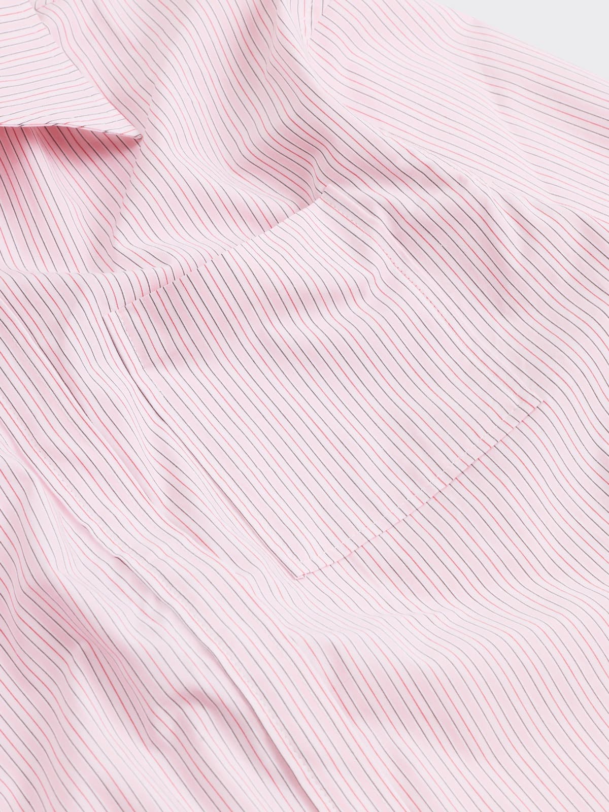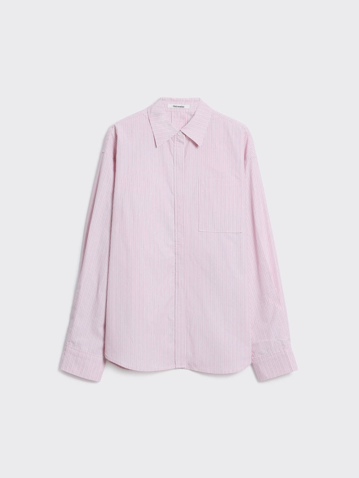 Stilig skjorte i lys rosa med sorte og rød og ton-i-ton rosa striper fra Holzweiler. Modellen er oversized med klassisk skjortekrage og skjult knappestolpe i front. Den har god lengde med lett buet hem og diskret patchlomme på brystet. Lange ermer med droppet skulder og knapper i mansjett. En avslappet bomullsskjorte med heldekkende stripemønsteret som utstråler klassisk og tidløs eleganse. Style den med en lys jeans eller shorts og sesongens lekreste sneakers.
