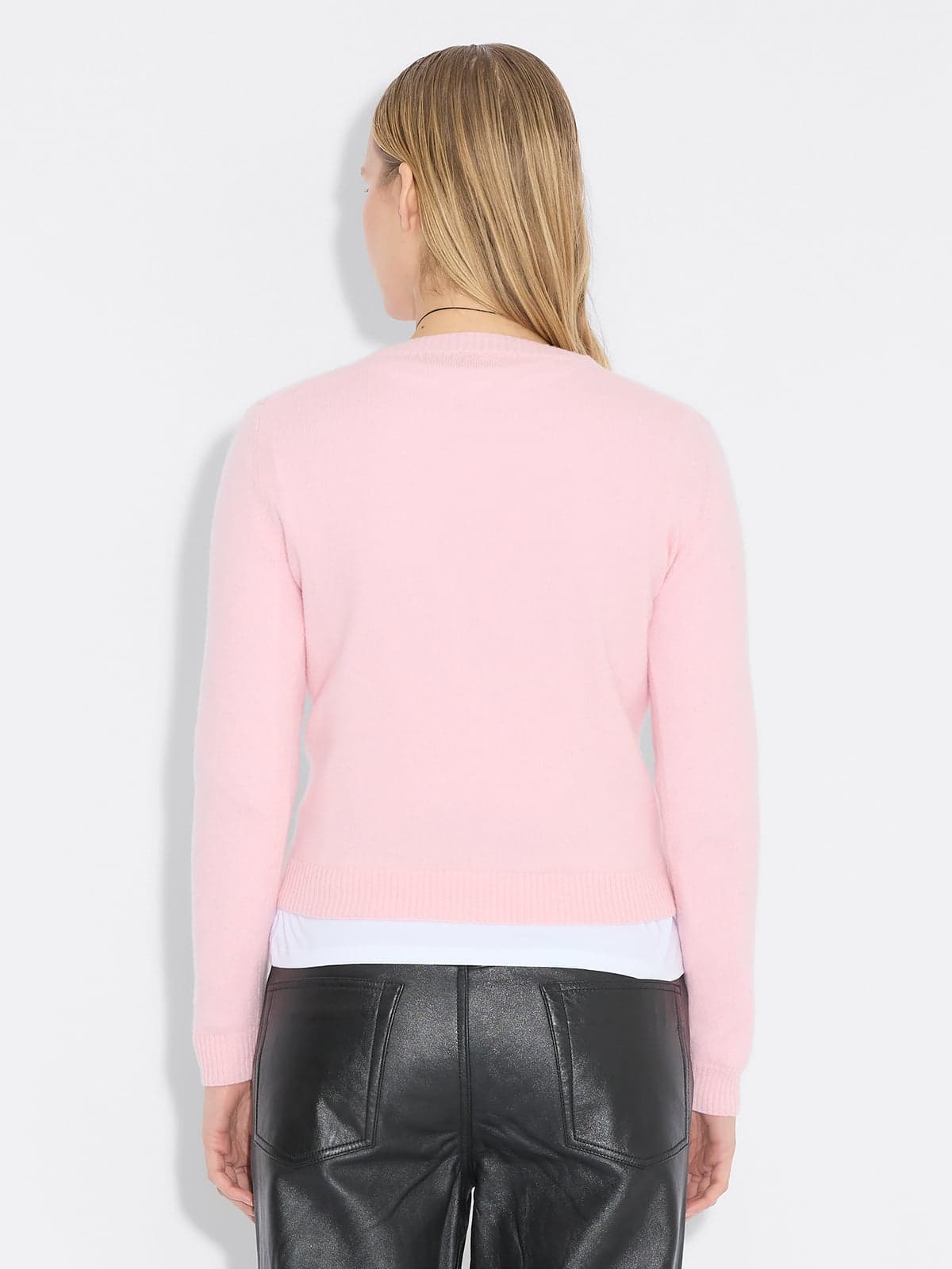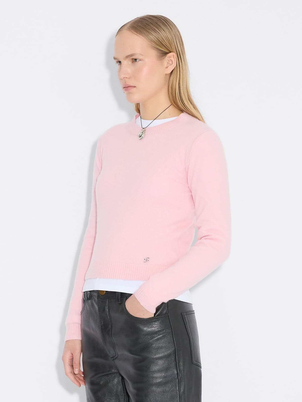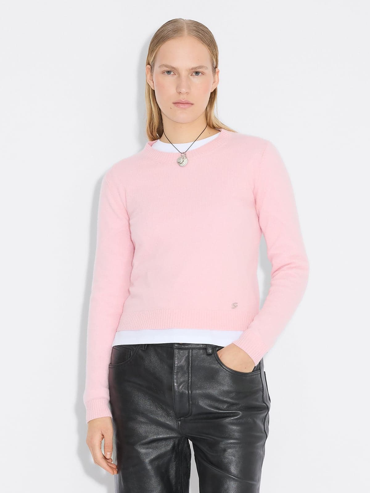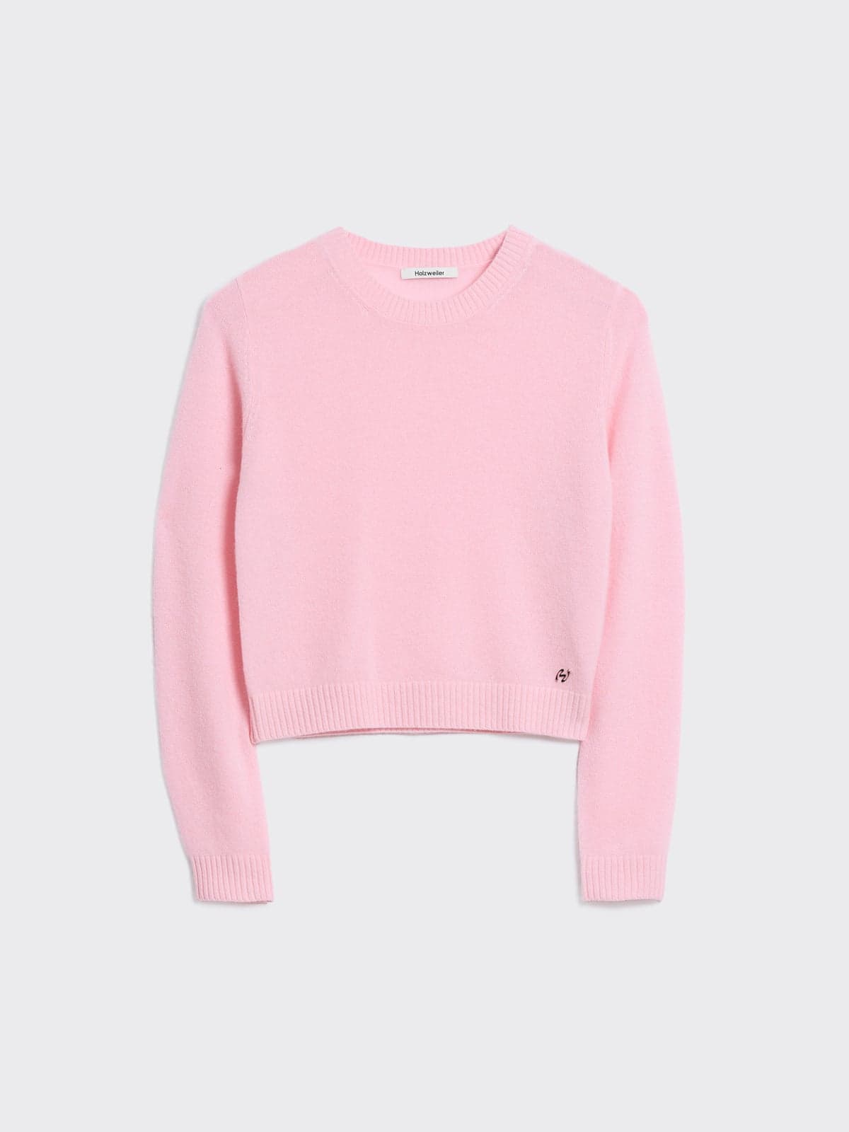 Søt strikk i lys rosa fra Holzweiler. Modellen er tettsittende med nett lengde og rund hals. Lange smale ermer og ribbestrikk i hals, hem og mansjett. Deilig, myk kvalitet i 100% cashmere. Superfin til jeans, skjørt eller over en kjole.
