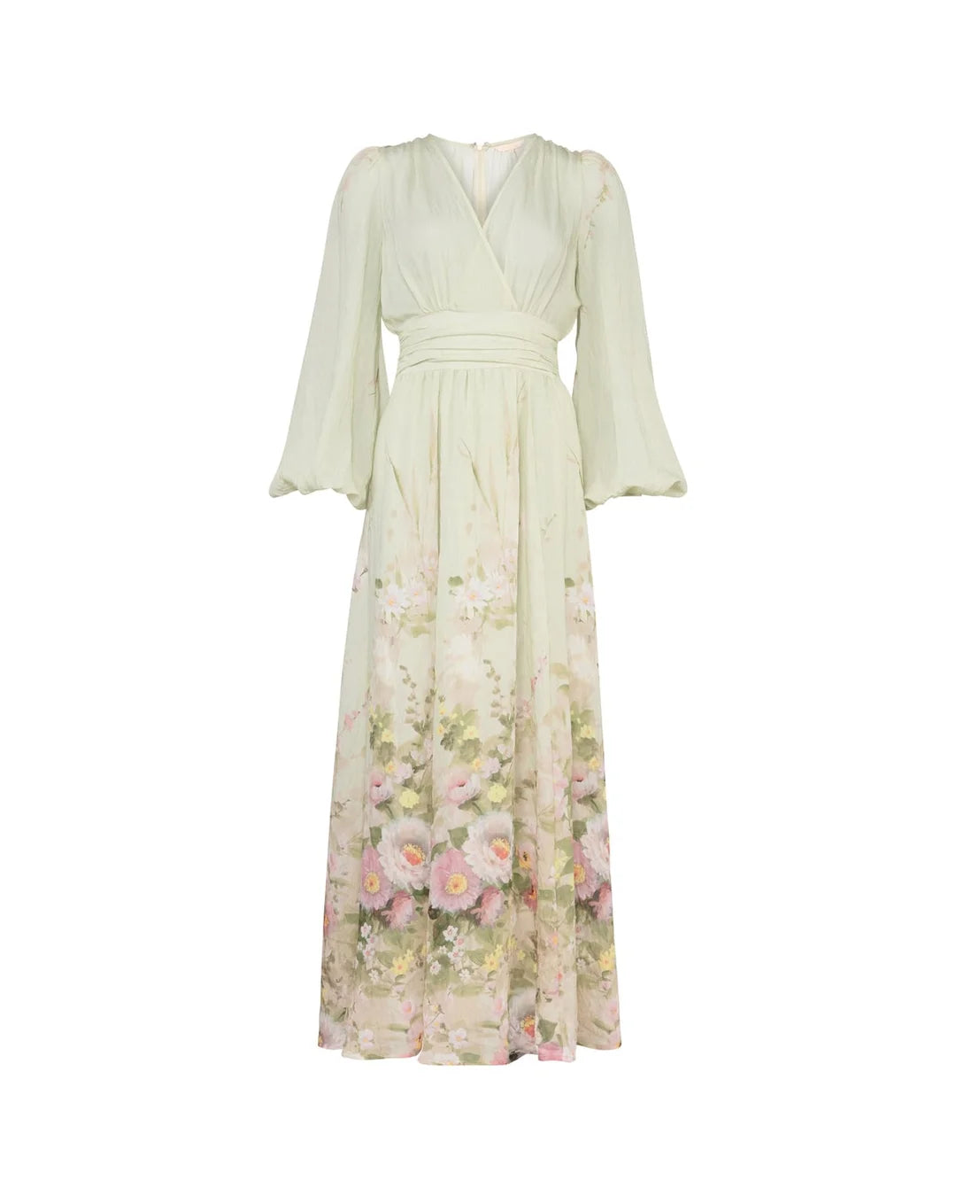 Nydelig kjole i lys grønn med flerfarget blomsterprint på skjørtet fra byTiMo. Modellen har V-hals med omslagsuttrykk og lange voluminøse ermer med lett puff i skuldre og elastisk mansjett. Plissert midje skaper en feminin silhuett og knytebånd i siden knytes til en delikat sløyfe i ryggen. Lett flowy skjørt som faller pent med maxilengde. En vakker kjole som er perfekt til alle sommerens festligheter. Style den med lyse hæler og en pen liten veske.