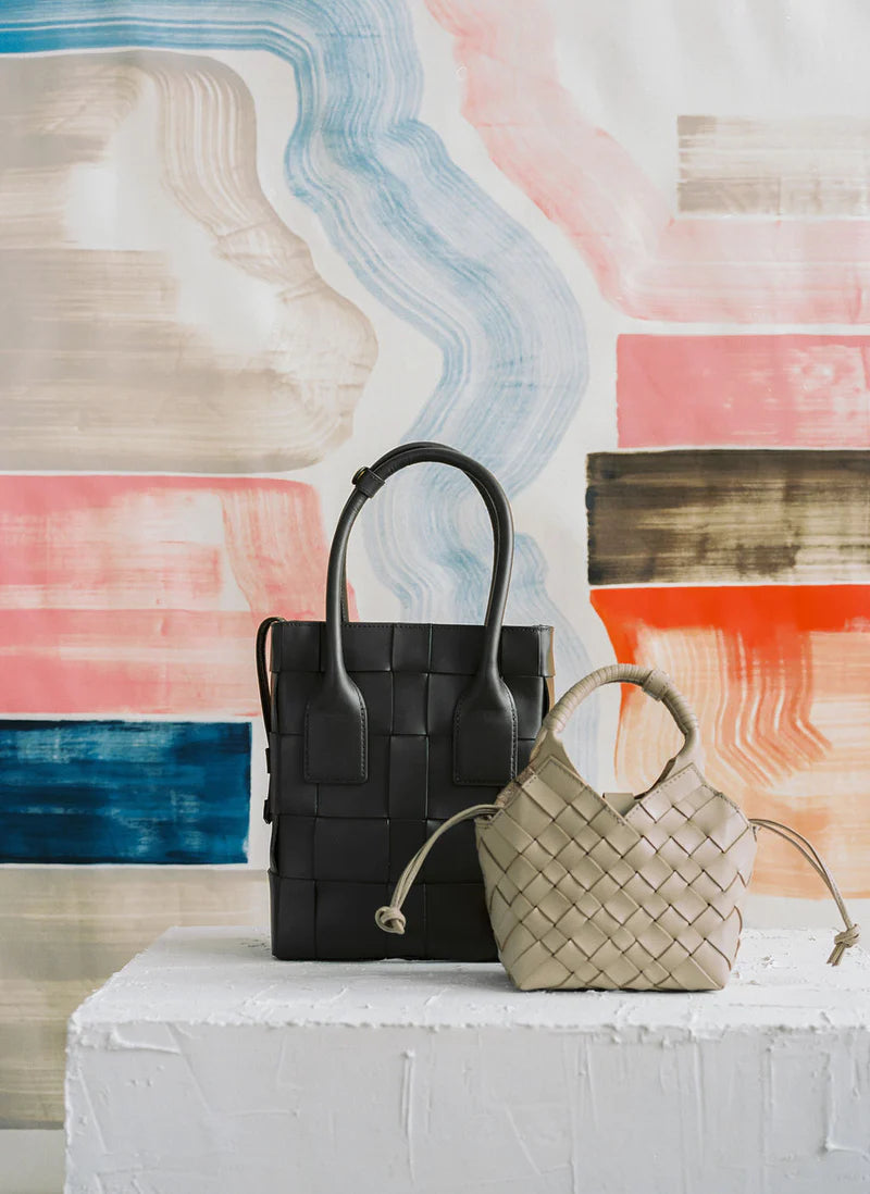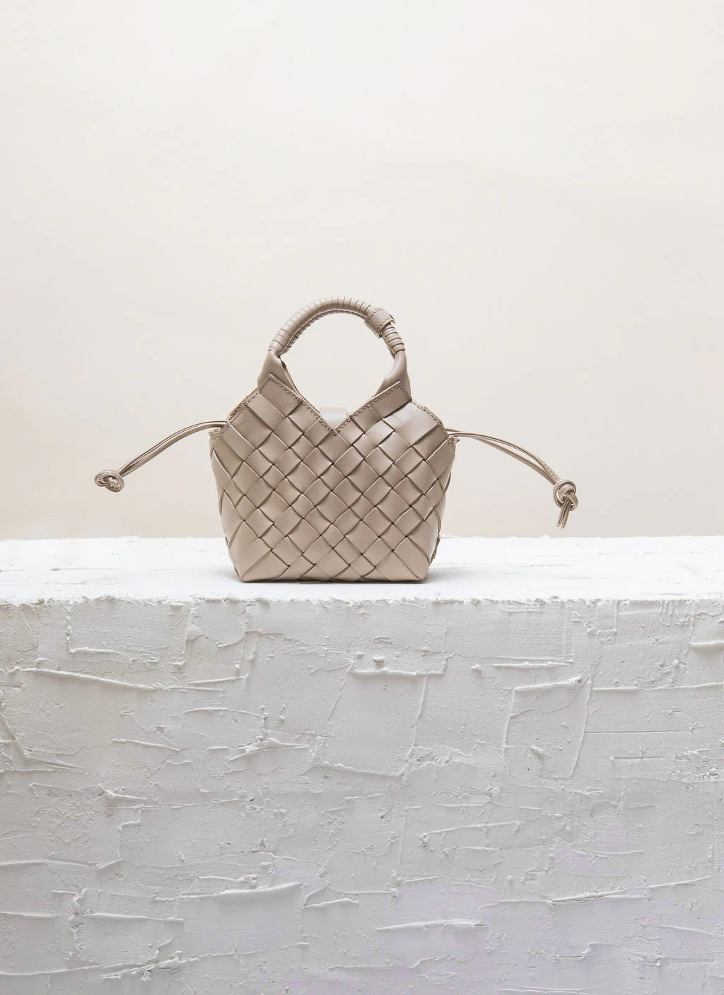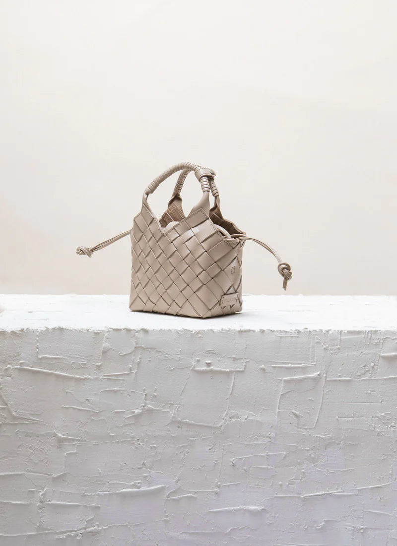 Den ikoniske Misu Mini fra norske CalaJade. En nett liten håndflettet veske, med doble håndtak og praktisk crossover reim. Vesken har et uttagbart tøynett, som lukkes med snøring og reim med skjult magnet på toppen. En liten veske som rommer det mest nødvendige. Med praktisk flat bunn og innvendig rom for tre bankkort. Her i delikat taupefarget skinnkvalitet.