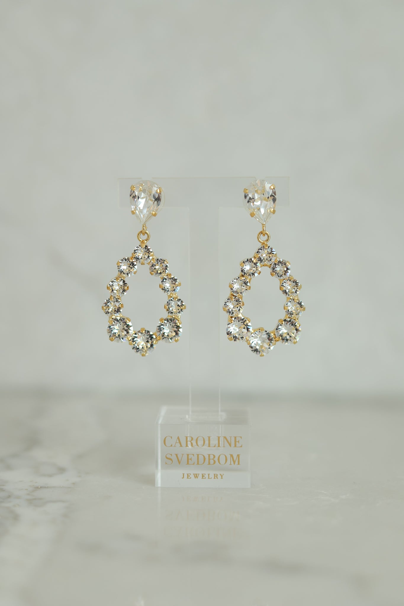 Delia er vakre statement øredobber med heng i Swarovski-krystaller. Her med blanke stener i forskjellige størrelser. Stift og bakside i gullforgyllt rhodium. Kombiner med matchende halskjede.